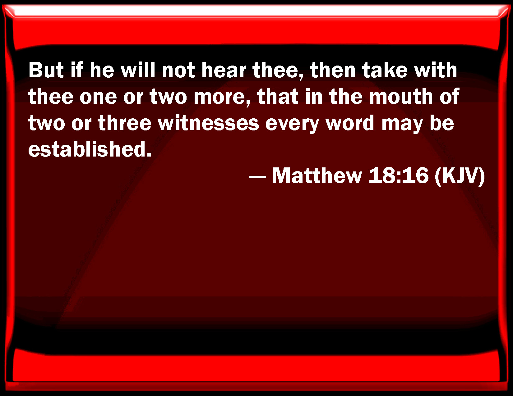 Bible Verse Slide Matthew 18:16 But if he will not hear you, then take with you one or two more, that in the mouth of two or three witnesses every word may be established. KJV: But if he will not hear thee, then take with thee one or two more, that in the mouth of two or three witnesses every word may be established. DRB: And if he will not hear thee, take with thee one or two more: that in the mouth of two or three witnesses every word may stand. DBT: But if he do not hear thee, take with thee one or two besides, that every matter may stand upon the word of two witnesses or of three. ERV: But if he hear thee not, take with thee one or two more, that at the mouth of two witnesses or three every word may be established. WBT: But if he will not hear thee, then take with thee one or two more, that in the mouth of two or three witnesses every word may be established. WEB: But if he doesn't listen, take one or two more with you, that at the mouth of two or three witnesses every word may be established. YLT: and if he may not hear, take with thee yet one or two, that by the mouth of two witnesses or three every word may stand.Links Matthew 18:16 NIV • Matthew 18:16 NLT • Matthew 18:16 ESV • Matthew 18:16 NASB • Matthew 18:16 KJV • Matthew 18:16 Interlinear • Matthew 18:16 Commentaries • Matthew 18:16 Parallel Texts • Matthew 18:16 Bible Apps • Matthew 18:16 Parallel • Bible Hub |