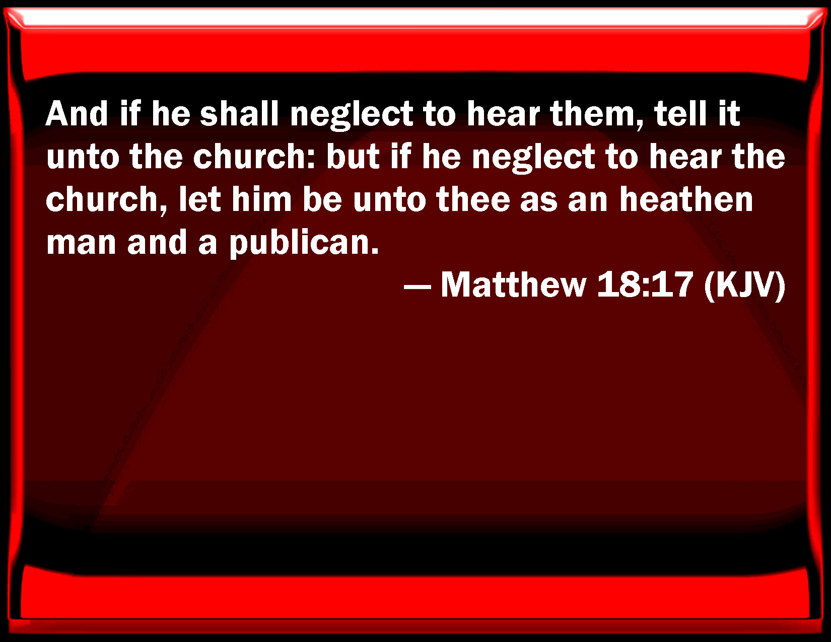 Bible Verse Slide Matthew 18:17 And if he shall neglect to hear them, tell it to the church: but if he neglect to hear the church, let him be to you as an heathen man and a publican. KJV: And if he shall neglect to hear them, tell it unto the church: but if he neglect to hear the church, let him be unto thee as an heathen man and a publican. DRB: And if he will not hear them: tell the church. And if he will not hear the church, let him be to thee as the heathen and publican. DBT: But if he will not listen to them, tell it to the assembly; and if also he will not listen to the assembly, let him be to thee as one of the nations and a tax-gatherer. ERV: And if he refuse to hear them, tell it unto the church: and if he refuse to hear the church also, let him be unto thee as the Gentile and the publican. WBT: And if he shall neglect to hear them, tell it to the church: but if he shall neglect to hear the church, let him be to thee as a heathen and a publican. WEB: If he refuses to listen to them, tell it to the assembly. If he refuses to hear the assembly also, let him be to you as a Gentile or a tax collector. YLT: And if he may not hear them, say it to the assembly, and if also the assembly he may not hear, let him be to thee as the heathen man and the tax-gatherer.Links Matthew 18:17 NIV • Matthew 18:17 NLT • Matthew 18:17 ESV • Matthew 18:17 NASB • Matthew 18:17 KJV • Matthew 18:17 Interlinear • Matthew 18:17 Commentaries • Matthew 18:17 Parallel Texts • Matthew 18:17 Bible Apps • Matthew 18:17 Parallel • Bible Hub |