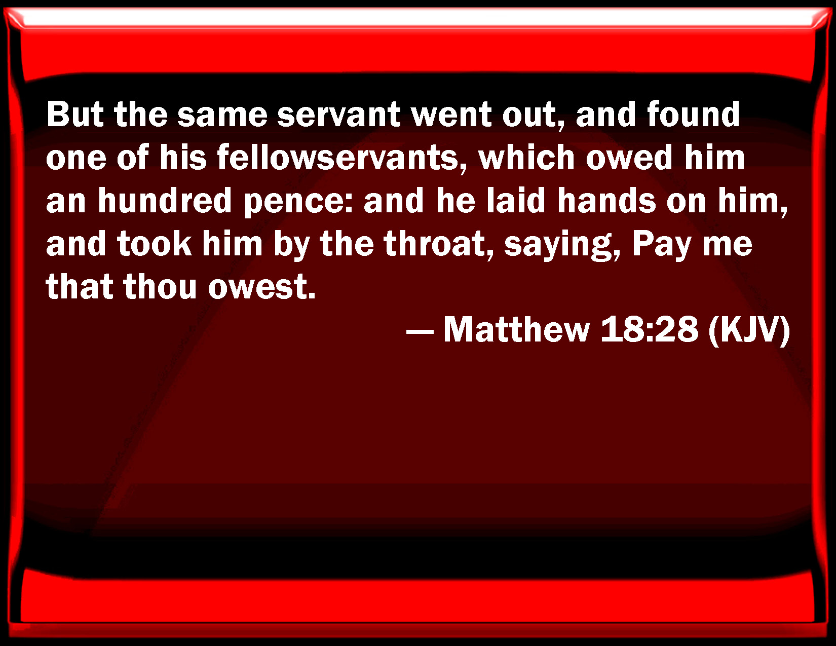 Bible Verse Slide Matthew 18:28 But the same servant went out, and found one of his fellow servants, which owed him an hundred pence: and he laid hands on him, and took him by the throat, saying, Pay me that you owe. KJV: But the same servant went out, and found one of his fellowservants, which owed him an hundred pence: and he laid hands on him, and took him by the throat, saying, Pay me that thou owest. DRB: But when that servant was gone out, he found one of his fellow servants that owed him an hundred pence: and laying hold of him, throttled him, saying: Pay what thou owest. DBT: But that bondman having gone out, found one of his fellow-bondmen who owed him a hundred denarii. And having seized him, he throttled him, saying, Pay me if thou owest anything. ERV: But that servant went out, and found one of his fellow-servants, which owed him a hundred pence: and he laid hold on him, and took him by the throat, saying, Pay what thou owest. WBT: But the same servant went out, and found one of his fellow-servants, who owed him a hundred pence: and he laid hands on him, and took him by the throat, saying, Pay me what thou owest. WEB: "But that servant went out, and found one of his fellow servants, who owed him one hundred denarii, and he grabbed him, and took him by the throat, saying, 'Pay me what you owe!' YLT: 'And, that servant having come forth, found one of his fellow-servants who was owing him an hundred denaries, and having laid hold, he took him by the throat, saying, Pay me that which thou owest.Links Matthew 18:28 NIV • Matthew 18:28 NLT • Matthew 18:28 ESV • Matthew 18:28 NASB • Matthew 18:28 KJV • Matthew 18:28 Interlinear • Matthew 18:28 Commentaries • Matthew 18:28 Parallel Texts • Matthew 18:28 Bible Apps • Matthew 18:28 Parallel • Bible Hub |