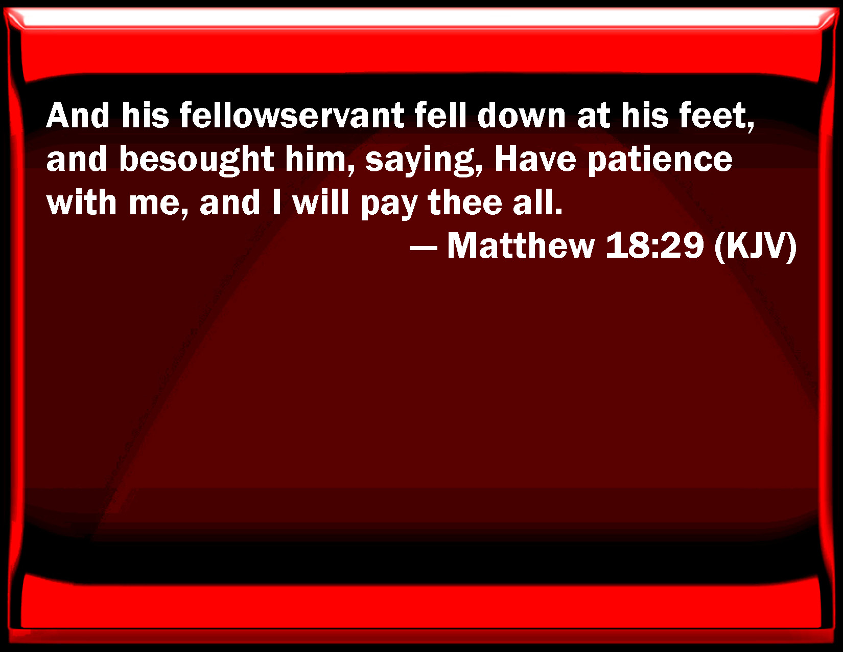 Bible Verse Slide Matthew 18:29 And his fellow servant fell down at his feet, and sought him, saying, Have patience with me, and I will pay you all. KJV: And his fellowservant fell down at his feet, and besought him, saying, Have patience with me, and I will pay thee all. DRB: And his fellow servant falling down, besought him, saying: Have patience with me, and I will pay thee all. DBT: His fellow-bondman therefore, having fallen down at his feet, besought him, saying, Have patience with me, and I will pay thee. ERV: So his fellow-servant fell down and besought him, saying, Have patience with me, and I will pay thee. WBT: And his fellow-servant fell down at his feet, and besought him, saying, Have patience with me, and I will pay thee all. WEB: "So his fellow servant fell down at his feet and begged him, saying, 'Have patience with me, and I will repay you!' YLT: His fellow-servant then, having fallen down at his feet, was calling on him, saying, Have patience with me, and I will pay thee all;Links Matthew 18:29 NIV • Matthew 18:29 NLT • Matthew 18:29 ESV • Matthew 18:29 NASB • Matthew 18:29 KJV • Matthew 18:29 Interlinear • Matthew 18:29 Commentaries • Matthew 18:29 Parallel Texts • Matthew 18:29 Bible Apps • Matthew 18:29 Parallel • Bible Hub |