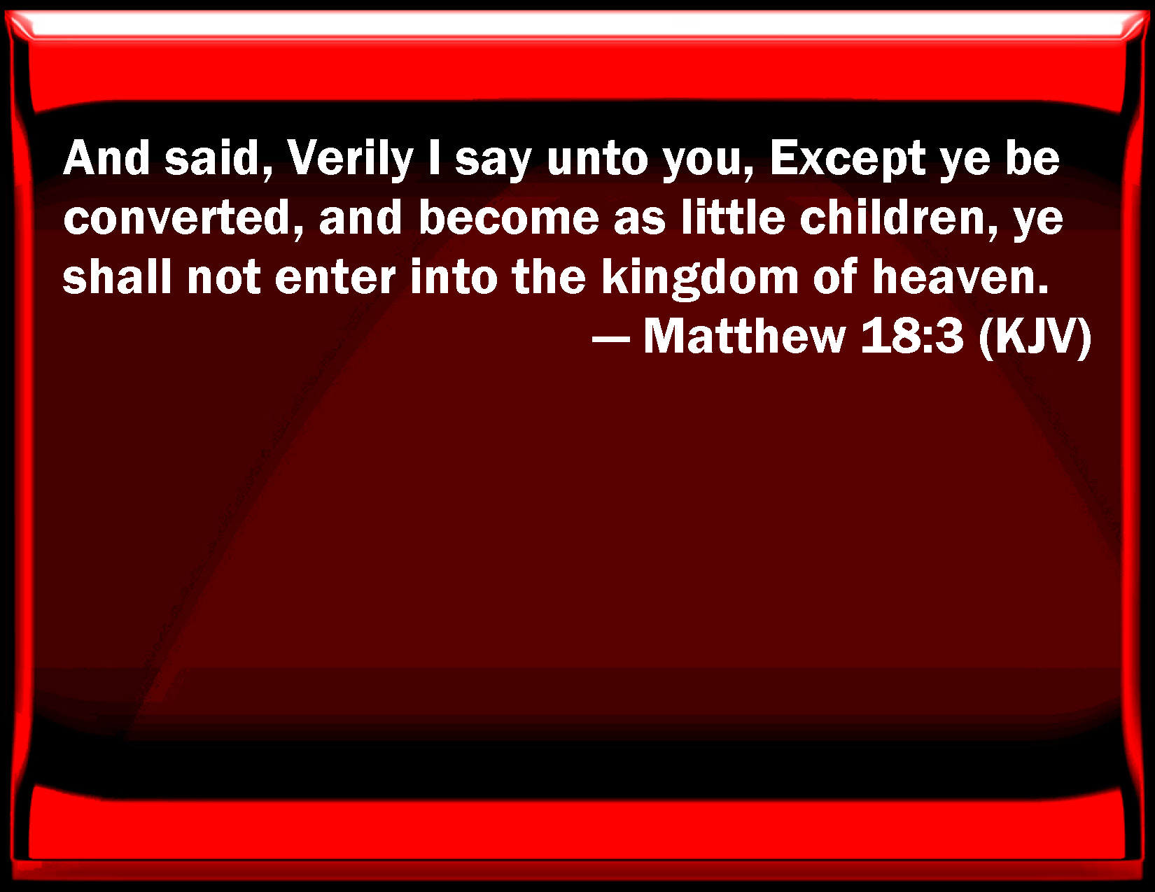 Bible Verse Slide Matthew 18:3 And said, Truly I say to you, Except you be converted, and become as little children, you shall not enter into the kingdom of heaven. KJV: And said, Verily I say unto you, Except ye be converted, and become as little children, ye shall not enter into the kingdom of heaven. DRB: And said: Amen I say to you, unless you be converted, and become as little children, you shall not enter into the kingdom of heaven. DBT: and said, Verily I say to you, Unless ye are converted and become as little children, ye will not at all enter into the kingdom of the heavens. ERV: and said, Verily I say unto you, Except ye turn, and become as little children, ye shall in no wise enter into the kingdom of heaven. WBT: And said, Verily I say to you, Except ye be converted, and become as little children, ye shall not enter into the kingdom of heaven. WEB: and said, "Most certainly I tell you, unless you turn, and become as little children, you will in no way enter into the Kingdom of Heaven. YLT: and said, 'Verily I say to you, if ye may not be turned and become as the children, ye may not enter into the reign of the heavens;Links Matthew 18:3 NIV • Matthew 18:3 NLT • Matthew 18:3 ESV • Matthew 18:3 NASB • Matthew 18:3 KJV • Matthew 18:3 Interlinear • Matthew 18:3 Commentaries • Matthew 18:3 Parallel Texts • Matthew 18:3 Bible Apps • Matthew 18:3 Parallel • Bible Hub |
