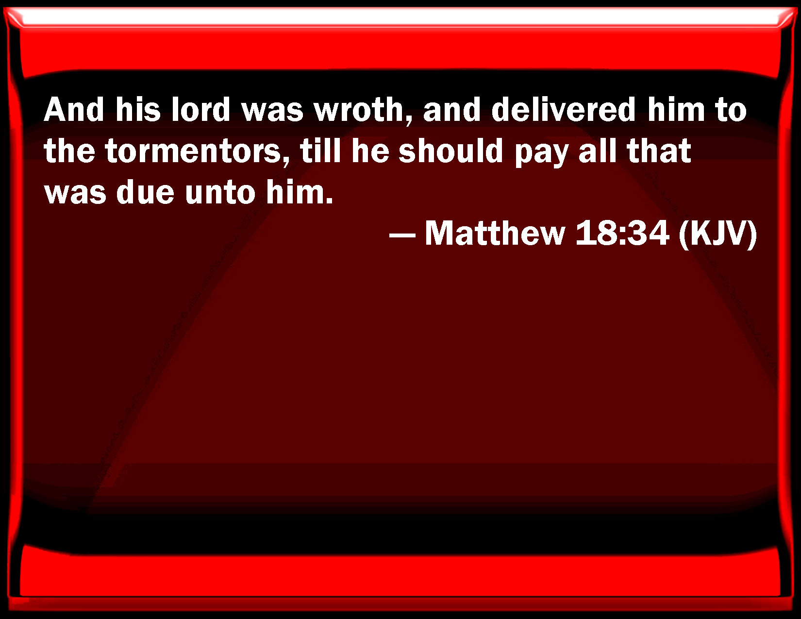 Bible Verse Slide Matthew 18:34 And his lord was wroth, and delivered him to the tormentors, till he should pay all that was due to him. KJV: And his lord was wroth, and delivered him to the tormentors, till he should pay all that was due unto him. DRB: And his lord being angry, delivered him to the torturers until he paid all the debt. DBT: And his lord being angry delivered him to the tormentors till he paid all that was owing to him. ERV: And his lord was wroth, and delivered him to the tormentors, till he should pay all that was due. WBT: And his lord was wroth, and delivered him to the tormentors, till he should pay all that was due to him. WEB: His lord was angry, and delivered him to the tormentors, until he should pay all that was due to him. YLT: 'And having been wroth, his lord delivered him to the inquisitors, till he might pay all that was owing to him;Links Matthew 18:34 NIV • Matthew 18:34 NLT • Matthew 18:34 ESV • Matthew 18:34 NASB • Matthew 18:34 KJV • Matthew 18:34 Interlinear • Matthew 18:34 Commentaries • Matthew 18:34 Parallel Texts • Matthew 18:34 Bible Apps • Matthew 18:34 Parallel • Bible Hub |