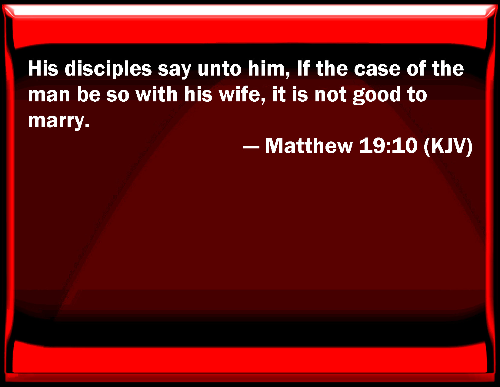 Bible Verse Slide Matthew 19:10 His disciples say to him, If the case of the man be so with his wife, it is not good to marry. KJV: His disciples say unto him, If the case of the man be so with his wife, it is not good to marry. DRB: His disciples say unto him: If the case of a man with his wife be so, it is not expedient to marry. DBT: His disciples say to him, If the case of the man be so with his wife, it is not good to marry. ERV: The disciples say unto him, If the case of the man is so with his wife, it is not expedient to marry. WBT: His disciples say to him, If the case of the man is so with his wife, it is not good to marry. WEB: His disciples said to him, "If this is the case of the man with his wife, it is not expedient to marry." YLT: His disciples say to him, 'If the case of the man with the woman is so, it is not good to marry.'Links Matthew 19:10 NIV • Matthew 19:10 NLT • Matthew 19:10 ESV • Matthew 19:10 NASB • Matthew 19:10 KJV • Matthew 19:10 Interlinear • Matthew 19:10 Commentaries • Matthew 19:10 Parallel Texts • Matthew 19:10 Bible Apps • Matthew 19:10 Parallel • Bible Hub |