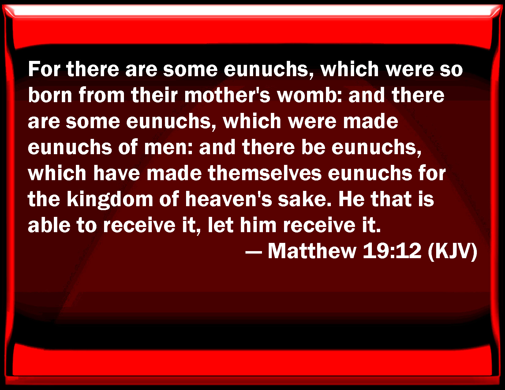 Matthew 19:12 For there are some eunuchs, which were so born from their mother's womb: and there are some eunuchs, which were made eunuchs of men: and there be eunuchs, which have made themselves eunuchs for the kingdom of heaven's sake. He that is able to receive it, let him receive it.