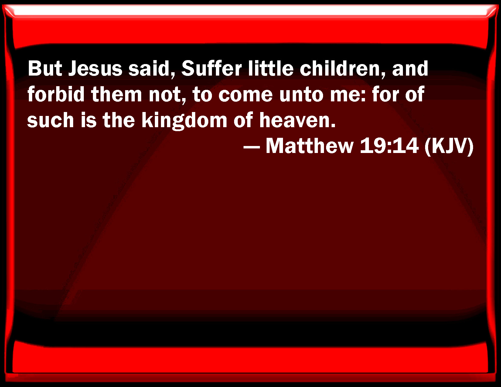 Bible Verse Slide Matthew 19:14 But Jesus said, Suffer little children, and forbid them not, to come to me: for of such is the kingdom of heaven. KJV: But Jesus said, Suffer little children, and forbid them not, to come unto me: for of such is the kingdom of heaven. DRB: But Jesus said to them: Suffer the little children, and forbid them not to come to me: for the kingdom of heaven is for such. DBT: But Jesus said, Suffer little children, and do not hinder them from coming to me; for the kingdom of the heavens is of such: ERV: But Jesus said, Suffer the little children, and forbid them not, to come unto me: for of such is the kingdom of heaven. WBT: But Jesus said, Suffer little children, and forbid them not to come to me: for of such is the kingdom of heaven. WEB: But Jesus said, "Allow the little children, and don't forbid them to come to me; for the Kingdom of Heaven belongs to ones like these." YLT: But Jesus said, 'Suffer the children, and forbid them not, to come unto me, for of such is the reign of the heavens;'Links Matthew 19:14 NIV • Matthew 19:14 NLT • Matthew 19:14 ESV • Matthew 19:14 NASB • Matthew 19:14 KJV • Matthew 19:14 Interlinear • Matthew 19:14 Commentaries • Matthew 19:14 Parallel Texts • Matthew 19:14 Bible Apps • Matthew 19:14 Parallel • Bible Hub |