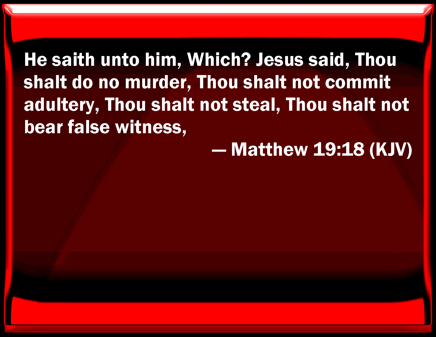 Bible Verse Slide Matthew 19:18 He said to him, Which? Jesus said, You shall do no murder, You shall not commit adultery, You shall not steal, You shall not bear false witness, KJV: He saith unto him, Which? Jesus said, Thou shalt do no murder, Thou shalt not commit adultery, Thou shalt not steal, Thou shalt not bear false witness, DRB: He said to him: Which? And Jesus said: Thou shalt do no murder, Thou shalt not commit adultery, Thou shalt not steal, Thou shalt not bear false witness. DBT: He says to him, Which? And Jesus said, Thou shalt not kill, Thou shalt not commit adultery, Thou shalt not steal, Thou shalt not bear false witness, ERV: He saith unto him, Which? And Jesus said, Thou shalt not kill, Thou shalt not commit adultery, Thou shalt not steal, Thou shalt not bear false witness, WBT: He saith to him, Which? Jesus said, Thou shalt do no murder, Thou shalt not commit adultery, Thou shalt not steal, Thou shalt not bear false witness, WEB: He said to him, "Which ones?" Jesus said, "'You shall not murder.' 'You shall not commit adultery.' 'You shall not steal.' 'You shall not offer false testimony.' YLT: He saith to him, 'What kind?' And Jesus said, 'Thou shalt not kill, thou shalt not commit adultery, thou shalt not steal, thou shalt not bear false witness,Links Matthew 19:18 NIV • Matthew 19:18 NLT • Matthew 19:18 ESV • Matthew 19:18 NASB • Matthew 19:18 KJV • Matthew 19:18 Interlinear • Matthew 19:18 Commentaries • Matthew 19:18 Parallel Texts • Matthew 19:18 Bible Apps • Matthew 19:18 Parallel • Bible Hub |