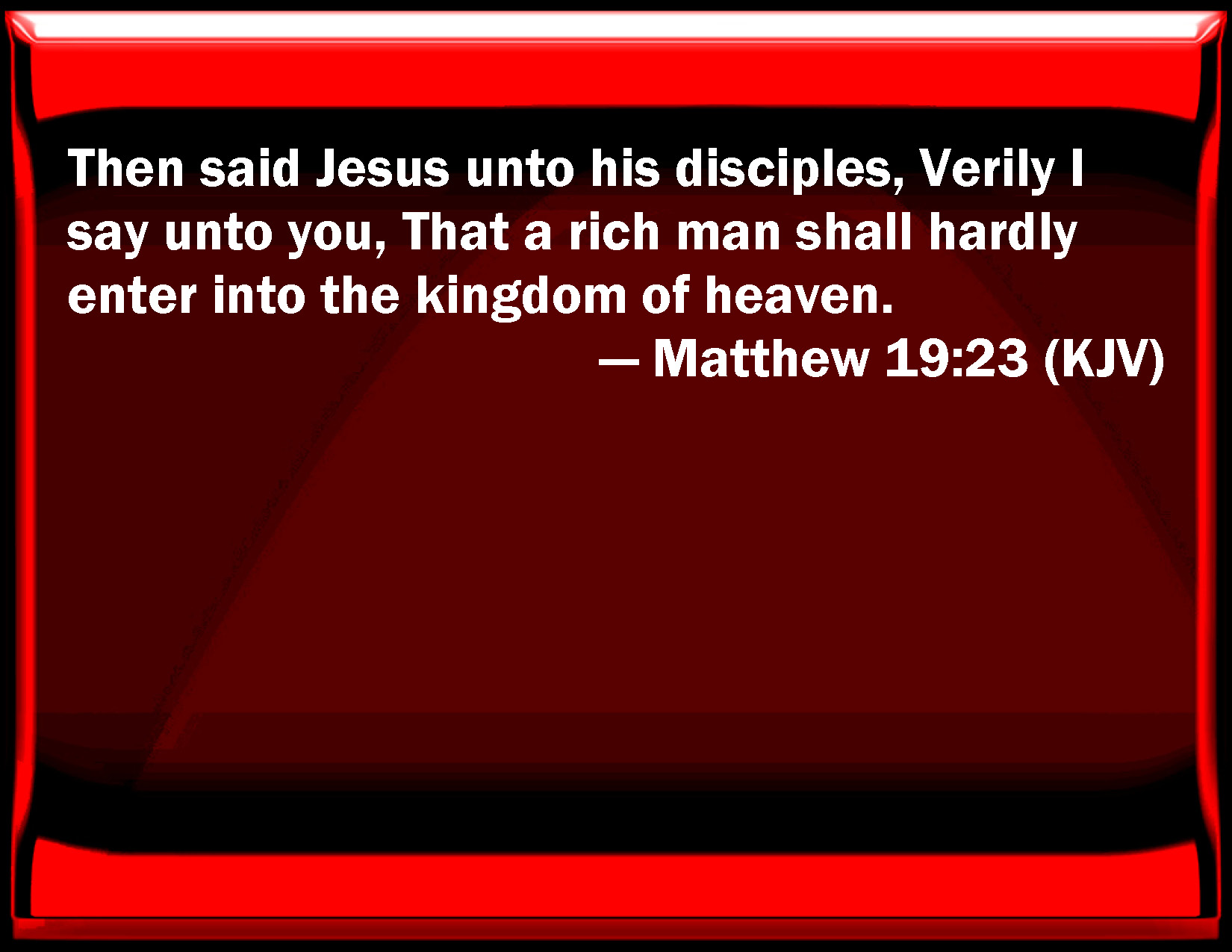 Bible Verse Slide Matthew 19:23 Then said Jesus to his disciples, Truly I say to you, That a rich man shall hardly enter into the kingdom of heaven. KJV: Then said Jesus unto his disciples, Verily I say unto you, That a rich man shall hardly enter into the kingdom of heaven. DRB: Then Jesus said to his disciples: Amen, I say to you, that a rich man shall hardly enter into the kingdom of heaven. DBT: And Jesus said to his disciples, Verily I say unto you, A rich man shall with difficulty enter into the kingdom of the heavens; ERV: And Jesus said unto his disciples, Verily I say unto you, It is hard for a rich man to enter into the kingdom of heaven. WBT: Then said Jesus to his disciples, Verily I say to you, that a rich man shall with difficulty enter into the kingdom of heaven. WEB: Jesus said to his disciples, "Most certainly I say to you, a rich man will enter into the Kingdom of Heaven with difficulty. YLT: and Jesus said to his disciples, 'Verily I say to you, that hardly shall a rich man enter into the reign of the heavens;Links Matthew 19:23 NIV • Matthew 19:23 NLT • Matthew 19:23 ESV • Matthew 19:23 NASB • Matthew 19:23 KJV • Matthew 19:23 Interlinear • Matthew 19:23 Commentaries • Matthew 19:23 Parallel Texts • Matthew 19:23 Bible Apps • Matthew 19:23 Parallel • Bible Hub |