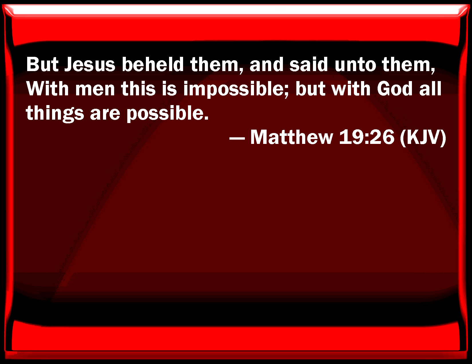 Bible Verse Slide Matthew 19:26 But Jesus beheld them, and said to them, With men this is impossible; but with God all things are possible. KJV: But Jesus beheld them, and said unto them, With men this is impossible; but with God all things are possible. DRB: And Jesus beholding, said to them: With men this is impossible: but with God all things are possible. DBT: But Jesus, looking on them, said to them, With men this is impossible; but with God all things are possible. ERV: And Jesus looking upon them said to them, With men this is impossible; but with God all things are possible. WBT: But Jesus beheld them, and said to them, With men this is impossible, but with God all things are possible. WEB: Looking at them, Jesus said, "With men this is impossible, but with God all things are possible." YLT: And Jesus having earnestly beheld, said to them, 'With men this is impossible, but with God all things are possible.'Links Matthew 19:26 NIV • Matthew 19:26 NLT • Matthew 19:26 ESV • Matthew 19:26 NASB • Matthew 19:26 KJV • Matthew 19:26 Interlinear • Matthew 19:26 Commentaries • Matthew 19:26 Parallel Texts • Matthew 19:26 Bible Apps • Matthew 19:26 Parallel • Bible Hub |