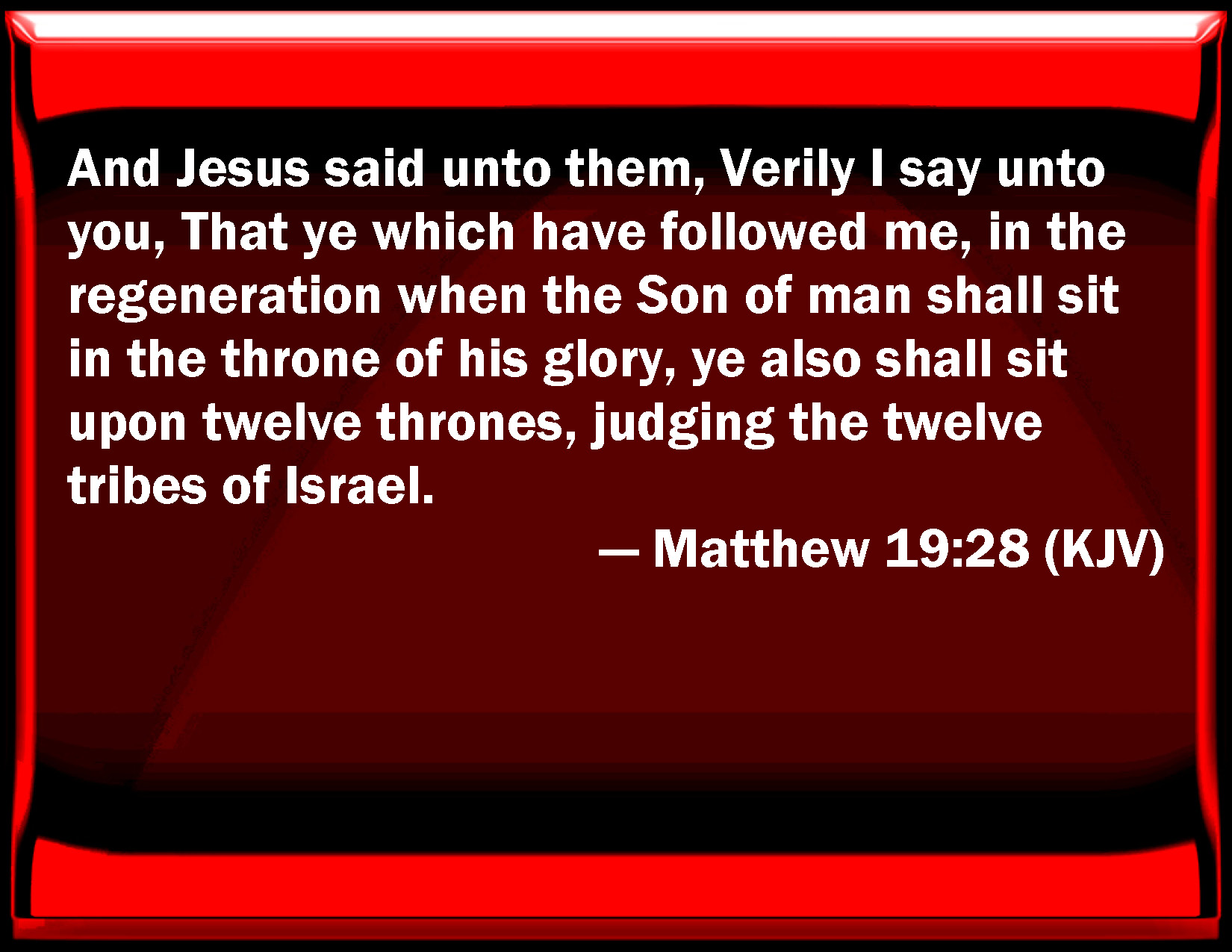Bible Verse Slide Matthew 19:28 And Jesus said to them, Truly I say to you, That you which have followed me, in the regeneration when the Son of man shall sit in the throne of his glory, you also shall sit on twelve thrones, judging the twelve tribes of Israel. KJV: And Jesus said unto them, Verily I say unto you, That ye which have followed me, in the regeneration when the Son of man shall sit in the throne of his glory, ye also shall sit upon twelve thrones, judging the twelve tribes of Israel. DRB: And Jesus said to them: Amen, I say to you, that you, who have followed me, in the regeneration, when the Son of man shall sit on the seat of his majesty, you also shall sit on twelve seats judging the twelve tribes of Israel. DBT: And Jesus said to them, Verily I say unto you, That ye who have followed me, in the regeneration when the Son of man shall sit down upon his throne of glory, ye also shall sit on twelve thrones, judging the twelve tribes of Israel. ERV: And Jesus said unto them, Verily I say unto you, that ye which have followed me, in the regeneration when the Son of man shall sit on the throne of his glory, ye also shall sit upon twelve thrones, judging the twelve tribes of Israel. WBT: And Jesus said to them, Verily I say to you, that ye who have followed me in the regeneration, when the Son of man shall sit on the throne of his glory, ye also shall sit upon twelve thrones, judging the twelve tribes of Israel. WEB: Jesus said to them, "Most certainly I tell you that you who have followed me, in the regeneration when the Son of Man will sit on the throne of his glory, you also will sit on twelve thrones, judging the twelve tribes of Israel. YLT: And Jesus said to them, 'Verily I say to you, that ye who did follow me, in the regeneration, when the Son of Man may sit upon a throne of his glory, shall sit — ye also — upon twelve thrones, judging the twelve tribes of Israel;Links Matthew 19:28 NIV • Matthew 19:28 NLT • Matthew 19:28 ESV • Matthew 19:28 NASB • Matthew 19:28 KJV • Matthew 19:28 Interlinear • Matthew 19:28 Commentaries • Matthew 19:28 Parallel Texts • Matthew 19:28 Bible Apps • Matthew 19:28 Parallel • Bible Hub |
