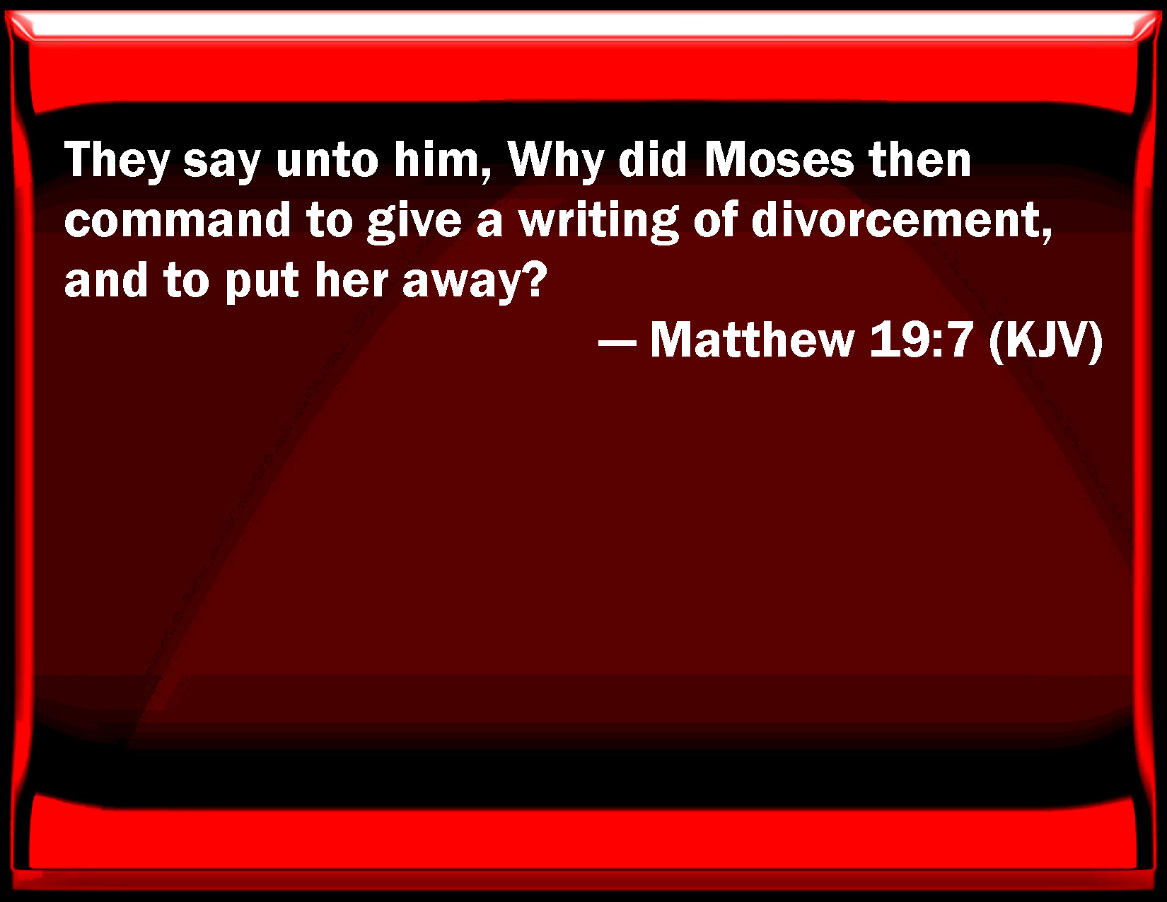 Bible Verse Slide Matthew 19:7 They say to him, Why did Moses then command to give a writing of divorce, and to put her away? KJV: They say unto him, Why did Moses then command to give a writing of divorcement, and to put her away? DRB: They say to him: Why then did Moses command to give a bill of divorce, and to put away? DBT: They say to him, Why then did Moses command to give a letter of divorce and to send her away? ERV: They say unto him, Why then did Moses command to give a bill of divorcement, and to put her away? WBT: They say to him, Why did Moses then command to give a writing of divorcement, and to put her away? WEB: They asked him, "Why then did Moses command us to give her a bill of divorce, and divorce her?" YLT: They say to him, 'Why then did Moses command to give a roll of divorce, and to put her away?'Links Matthew 19:7 NIV • Matthew 19:7 NLT • Matthew 19:7 ESV • Matthew 19:7 NASB • Matthew 19:7 KJV • Matthew 19:7 Interlinear • Matthew 19:7 Commentaries • Matthew 19:7 Parallel Texts • Matthew 19:7 Bible Apps • Matthew 19:7 Parallel • Bible Hub |