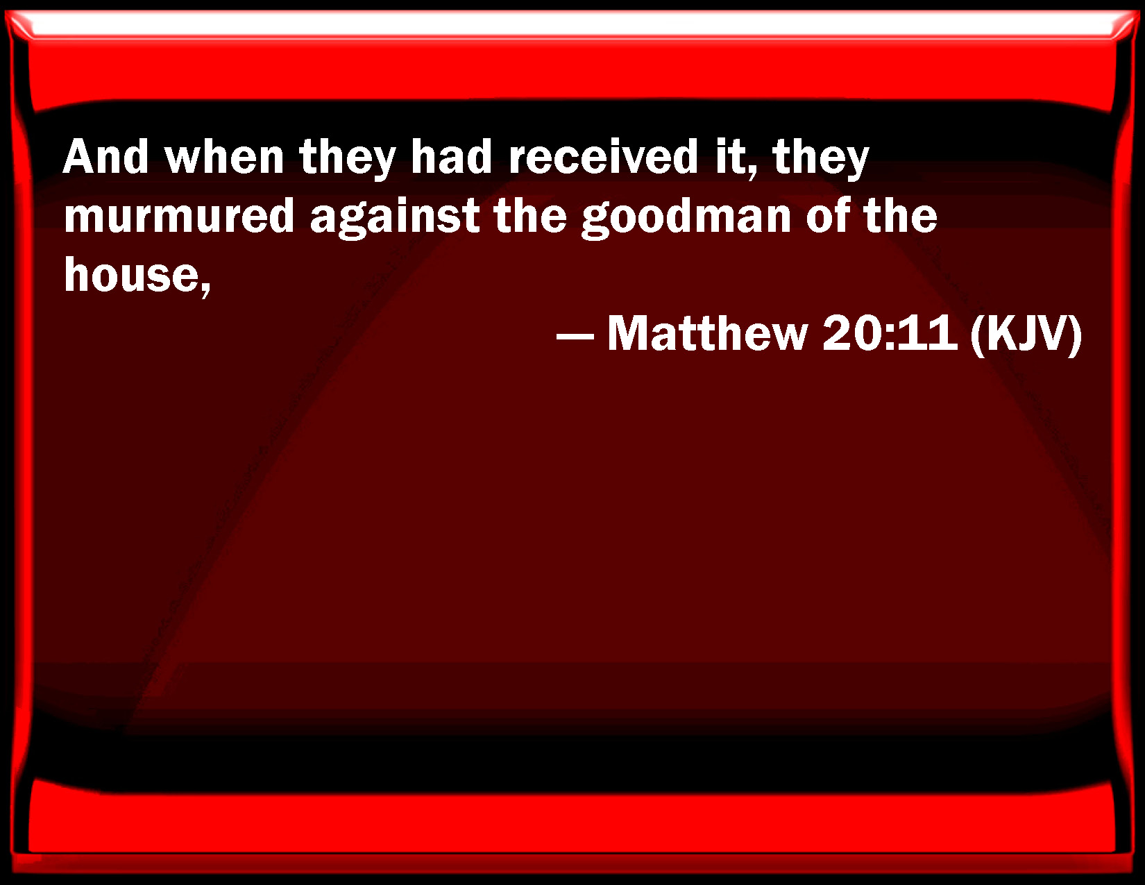 Bible Verse Slide Matthew 20:11 And when they had received it, they murmured against the manager of the house, KJV: And when they had received it, they murmured against the goodman of the house, DRB: And receiving it they murmured against the master of the house, DBT: And on receiving it they murmured against the master of the house, ERV: And when they received it, they murmured against the householder, WBT: And when they had received it, they murmured against the master of the house. WEB: When they received it, they murmured against the master of the household, YLT: and having received it, they were murmuring against the householder, saying,Links Matthew 20:11 NIV • Matthew 20:11 NLT • Matthew 20:11 ESV • Matthew 20:11 NASB • Matthew 20:11 KJV • Matthew 20:11 Interlinear • Matthew 20:11 Commentaries • Matthew 20:11 Parallel Texts • Matthew 20:11 Bible Apps • Matthew 20:11 Parallel • Bible Hub |