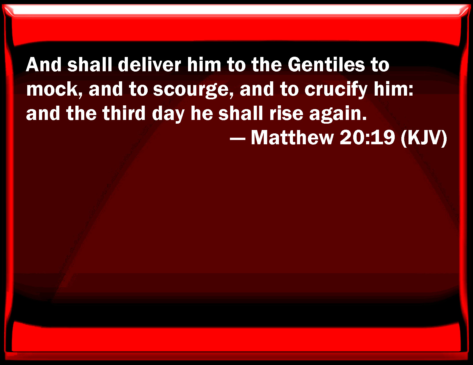 Bible Verse Slide Matthew 20:19 And shall deliver him to the Gentiles to mock, and to whip, and to crucify him: and the third day he shall rise again. KJV: And shall deliver him to the Gentiles to mock, and to scourge, and to crucify him: and the third day he shall rise again. DRB: And shall deliver him to the Gentiles to be mocked, and scourged, and crucified, and the third day he shall rise again. DBT: and they will deliver him up to the nations to mock and to scourge and to crucify, and the third day he shall rise again. ERV: and shall deliver him unto the Gentiles to mock, and to scourge, and to crucify: and the third day he shall be raised up. WBT: And will deliver him to the Gentiles to mock, and to scourge, and to crucify him: and the third day he will rise again. WEB: and will hand him over to the Gentiles to mock, to scourge, and to crucify; and the third day he will be raised up." YLT: and they shall condemn him to death, and shall deliver him to the nations to mock, and to scourge, and to crucify, and the third day he will rise again.'Links Matthew 20:19 NIV • Matthew 20:19 NLT • Matthew 20:19 ESV • Matthew 20:19 NASB • Matthew 20:19 KJV • Matthew 20:19 Interlinear • Matthew 20:19 Commentaries • Matthew 20:19 Parallel Texts • Matthew 20:19 Bible Apps • Matthew 20:19 Parallel • Bible Hub |