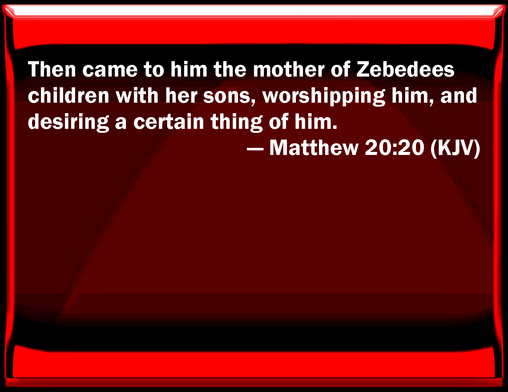 Bible Verse Slide Matthew 20:20 Then came to him the mother of Zebedees children with her sons, worshipping him, and desiring a certain thing of him. KJV: Then came to him the mother of Zebedee's children with her sons, worshipping him, and desiring a certain thing of him. DRB: Then came to him the mother of the sons of Zebedee with her sons, adoring and asking something of him. DBT: Then came to him the mother of the sons of Zebedee, with her sons, doing homage, and asking something of him. ERV: Then came to him the mother of the sons of Zebedee with her sons, worshipping him, and asking a certain thing of him. WBT: Then came to him the mother of Zebedee's children, with her sons, worshiping him, and desiring a certain thing of him. WEB: Then the mother of the sons of Zebedee came to him with her sons, kneeling and asking a certain thing of him. YLT: Then came near to him the mother of the sons of Zebedee, with her sons, bowing and asking something from him,Links Matthew 20:20 NIV • Matthew 20:20 NLT • Matthew 20:20 ESV • Matthew 20:20 NASB • Matthew 20:20 KJV • Matthew 20:20 Interlinear • Matthew 20:20 Commentaries • Matthew 20:20 Parallel Texts • Matthew 20:20 Bible Apps • Matthew 20:20 Parallel • Bible Hub |