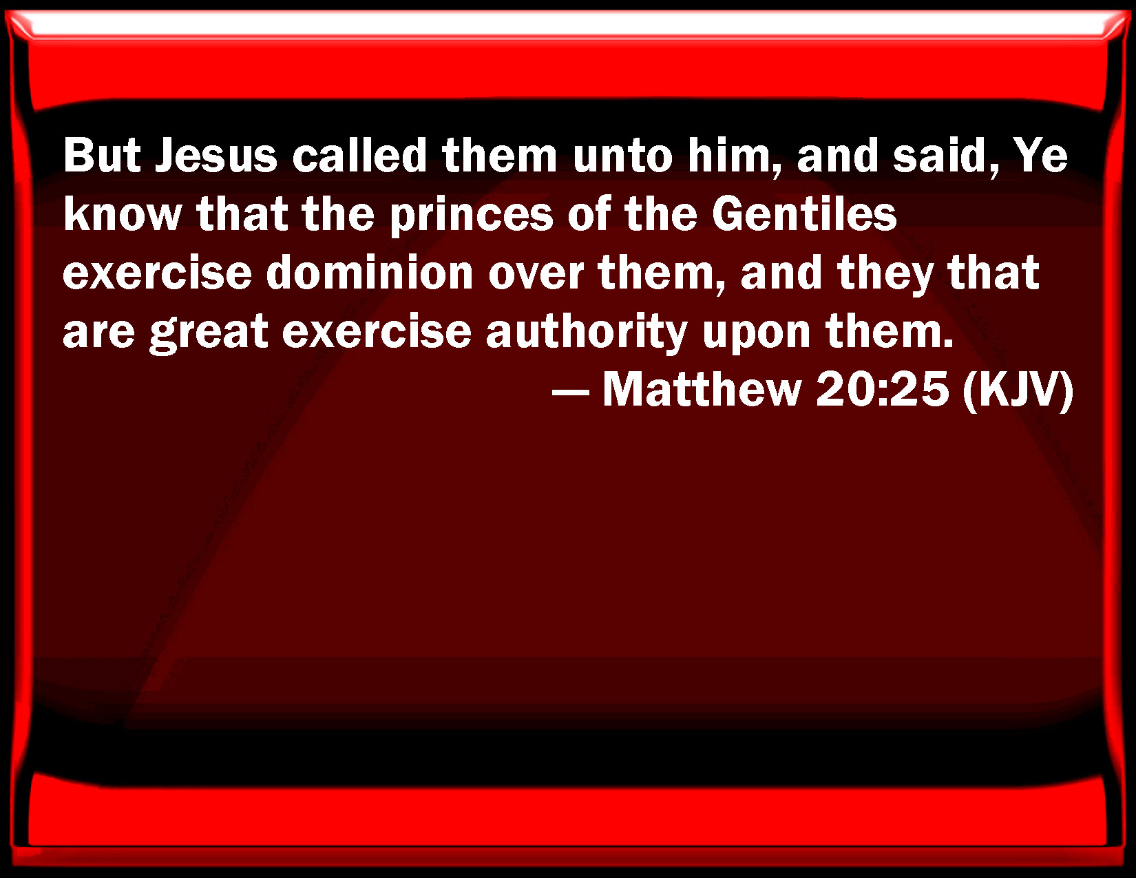 Bible Verse Slide Matthew 20:25 But Jesus called them to him, and said, You know that the princes of the Gentiles exercise dominion over them, and they that are great exercise authority on them. KJV: But Jesus called them unto him, and said, Ye know that the princes of the Gentiles exercise dominion over them, and they that are great exercise authority upon them. DRB: But Jesus called them to him, and said: You know that the princes of the Gentiles lord it over them; and they that are the greater, exercise power upon them. DBT: But Jesus having called them to him, said, Ye know that the rulers of the nations exercise lordship over them, and the great exercise authority over them. ERV: But Jesus called them unto him, and said, Ye know that the rulers of the Gentiles lord it over them, and their great ones exercise authority over them. WBT: But Jesus called them to him, and said, Ye know that the princes of the Gentiles exercise dominion over them, and they that are great exercise authority upon them. WEB: But Jesus summoned them, and said, "You know that the rulers of the nations lord it over them, and their great ones exercise authority over them. YLT: and Jesus having called them near, said, 'Ye have known that the rulers of the nations do exercise lordship over them, and those great do exercise authority over them,Links Matthew 20:25 NIV • Matthew 20:25 NLT • Matthew 20:25 ESV • Matthew 20:25 NASB • Matthew 20:25 KJV • Matthew 20:25 Interlinear • Matthew 20:25 Commentaries • Matthew 20:25 Parallel Texts • Matthew 20:25 Bible Apps • Matthew 20:25 Parallel • Bible Hub |