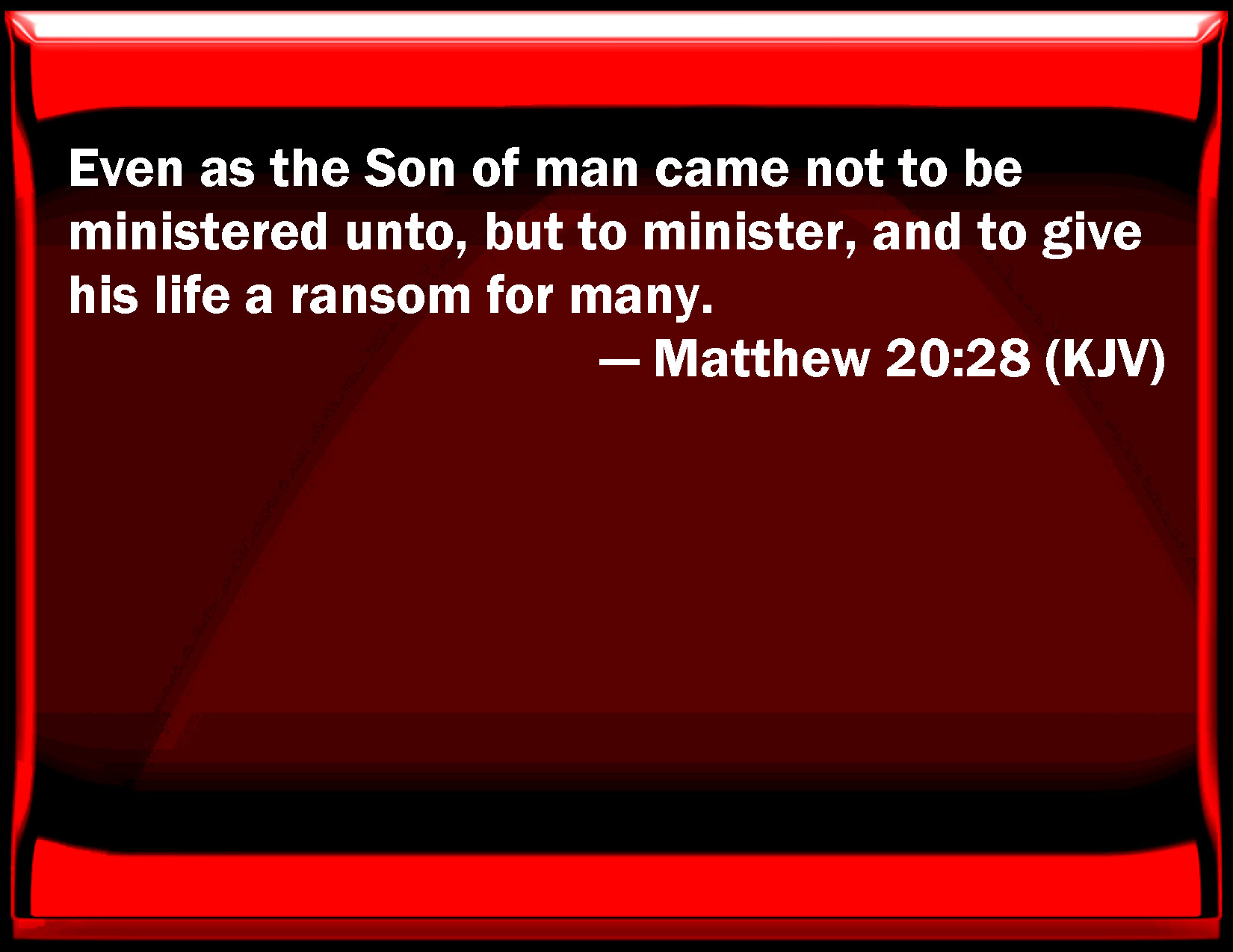 Bible Verse Slide Matthew 20:28 Even as the Son of man came not to be ministered to, but to minister, and to give his life a ransom for many. KJV: Even as the Son of man came not to be ministered unto, but to minister, and to give his life a ransom for many. DRB: Even as the Son of man is not come to be ministered unto, but to minister, and to give his life a redemption for many. DBT: as indeed the Son of man did not come to be served, but to serve, and to give his life a ransom for many. ERV: even as the Son of man came not to be ministered unto, but to minister, and to give his life a ransom for many. WBT: Even as the Son of man came not to be ministered to, but to minister, and to give his life a ransom for many. WEB: even as the Son of Man came not to be served, but to serve, and to give his life as a ransom for many." YLT: even as the Son of Man did not come to be ministered to, but to minister, and to give his life a ransom for many.'Links Matthew 20:28 NIV • Matthew 20:28 NLT • Matthew 20:28 ESV • Matthew 20:28 NASB • Matthew 20:28 KJV • Matthew 20:28 Interlinear • Matthew 20:28 Commentaries • Matthew 20:28 Parallel Texts • Matthew 20:28 Bible Apps • Matthew 20:28 Parallel • Bible Hub |
