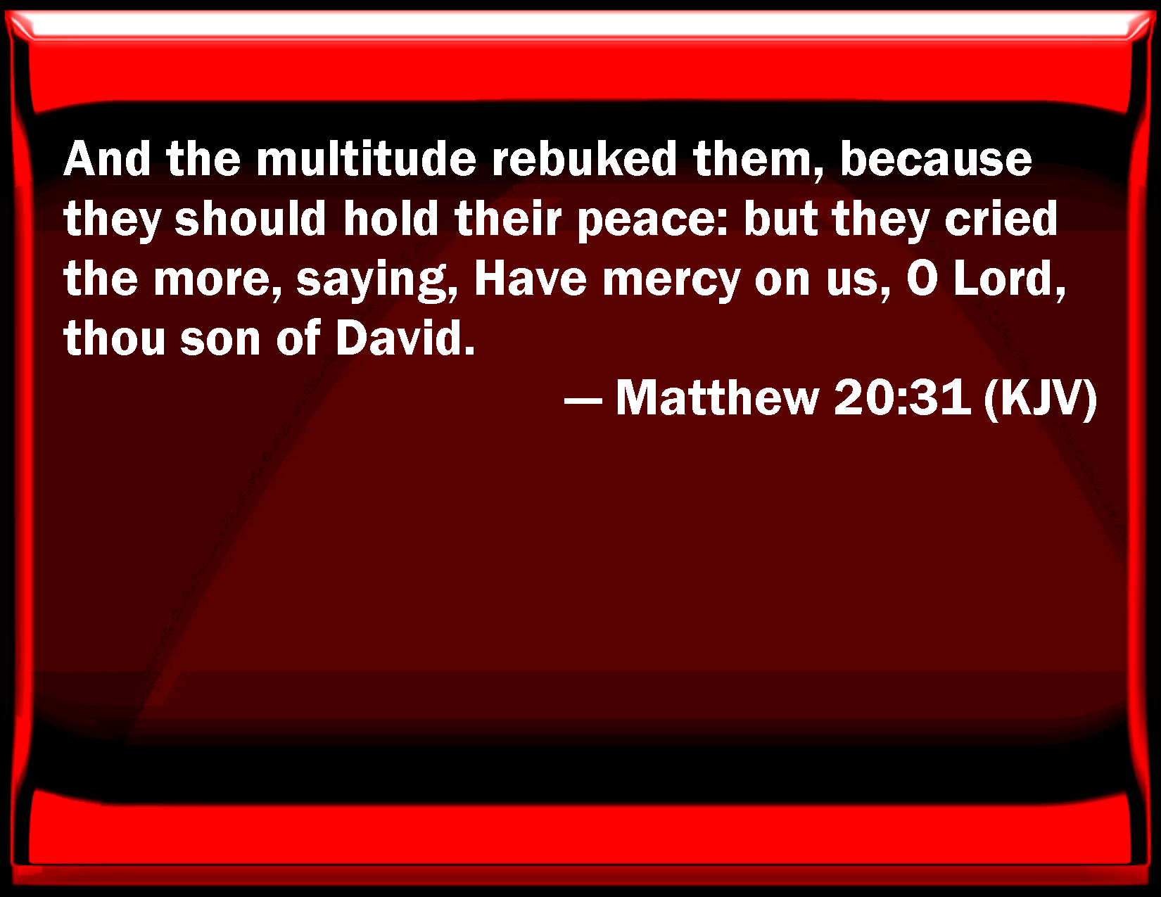 Bible Verse Slide Matthew 20:31 And the multitude rebuked them, because they should hold their peace: but they cried the more, saying, Have mercy on us, O Lord, you son of David. KJV: And the multitude rebuked them, because they should hold their peace: but they cried the more, saying, Have mercy on us, O Lord, thou Son of David. DRB: And the multitude rebuked them that they should hold their peace. But they cried out the more, saying: O Lord, thou son of David, have mercy on us. DBT: But the crowd rebuked them, that they might be silent. But they cried out the more, saying, Have mercy on us, Lord, Son of David. ERV: And the multitude rebuked them, that they should hold their peace: but they cried out the more, saying, Lord, have mercy on us, thou son of David. WBT: And the multitude rebuked them, that they should hold their peace: but they cried the more, saying, Have mercy on us, O Lord, thou son of David. WEB: The multitude rebuked them, telling them that they should be quiet, but they cried out even more, "Lord, have mercy on us, you son of David!" YLT: And the multitude charged them that they might be silent, and they cried out the more, saying, 'Deal kindly with us sir — Son of David.'Links Matthew 20:31 NIV • Matthew 20:31 NLT • Matthew 20:31 ESV • Matthew 20:31 NASB • Matthew 20:31 KJV • Matthew 20:31 Interlinear • Matthew 20:31 Commentaries • Matthew 20:31 Parallel Texts • Matthew 20:31 Bible Apps • Matthew 20:31 Parallel • Bible Hub |