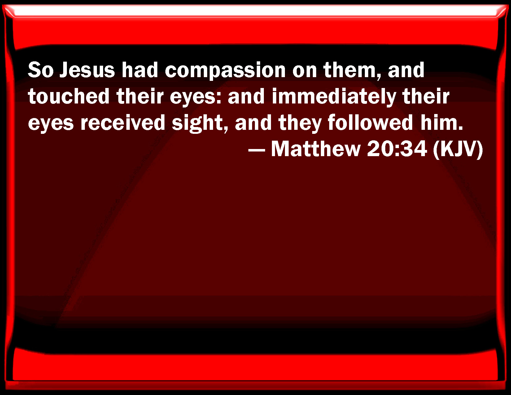 Bible Verse Slide Matthew 20:34 So Jesus had compassion on them, and touched their eyes: and immediately their eyes received sight, and they followed him. KJV: So Jesus had compassion on them, and touched their eyes: and immediately their eyes received sight, and they followed him. DRB: And Jesus having compassion on them, touched their eyes. And immediately they saw, and followed him. DBT: And Jesus, moved with compassion, touched their eyes; and immediately their eyes had sight restored to them, and they followed him. ERV: And Jesus, being moved with compassion, touched their eyes: and straightway they received their sight, and followed him. WBT: So Jesus had compassion on them, and touched their eyes: and immediately their eyes received sight, and they followed him. WEB: Jesus, being moved with compassion, touched their eyes; and immediately their eyes received their sight, and they followed him. YLT: and having been moved with compassion, Jesus touched their eyes, and immediately their eyes received sight, and they followed him.Links Matthew 20:34 NIV • Matthew 20:34 NLT • Matthew 20:34 ESV • Matthew 20:34 NASB • Matthew 20:34 KJV • Matthew 20:34 Interlinear • Matthew 20:34 Commentaries • Matthew 20:34 Parallel Texts • Matthew 20:34 Bible Apps • Matthew 20:34 Parallel • Bible Hub |
