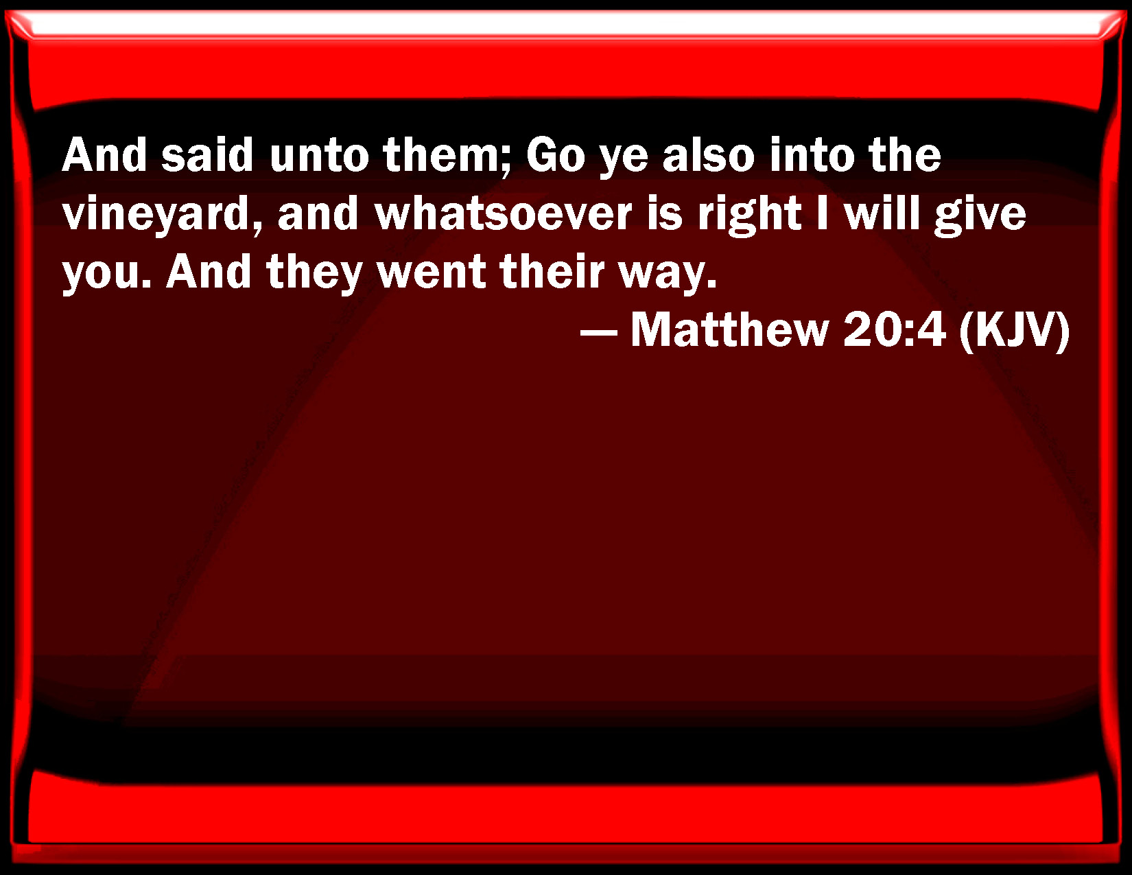 Bible Verse Slide Matthew 20:4 And said to them; Go you also into the vineyard, and whatever is right I will give you. And they went their way. KJV: And said unto them; Go ye also into the vineyard, and whatsoever is right I will give you. And they went their way. DRB: And he said to them: Go you also into my vineyard, and I will give you what shall be just. DBT: and to them he said, Go also ye into the vineyard, and whatsoever may be just I will give you. And they went their way. ERV: and to them he said, Go ye also into the vineyard, and whatsoever is right I will give you. And they went their way. WBT: And said to them, Go ye also into the vineyard; and whatever is right, I will give you. And they departed. WEB: To them he said, 'You also go into the vineyard, and whatever is right I will give you.' So they went their way. YLT: and to these he said, Go ye — also ye — to the vineyard, and whatever may be righteous I will give you;Links Matthew 20:4 NIV • Matthew 20:4 NLT • Matthew 20:4 ESV • Matthew 20:4 NASB • Matthew 20:4 KJV • Matthew 20:4 Interlinear • Matthew 20:4 Commentaries • Matthew 20:4 Parallel Texts • Matthew 20:4 Bible Apps • Matthew 20:4 Parallel • Bible Hub |