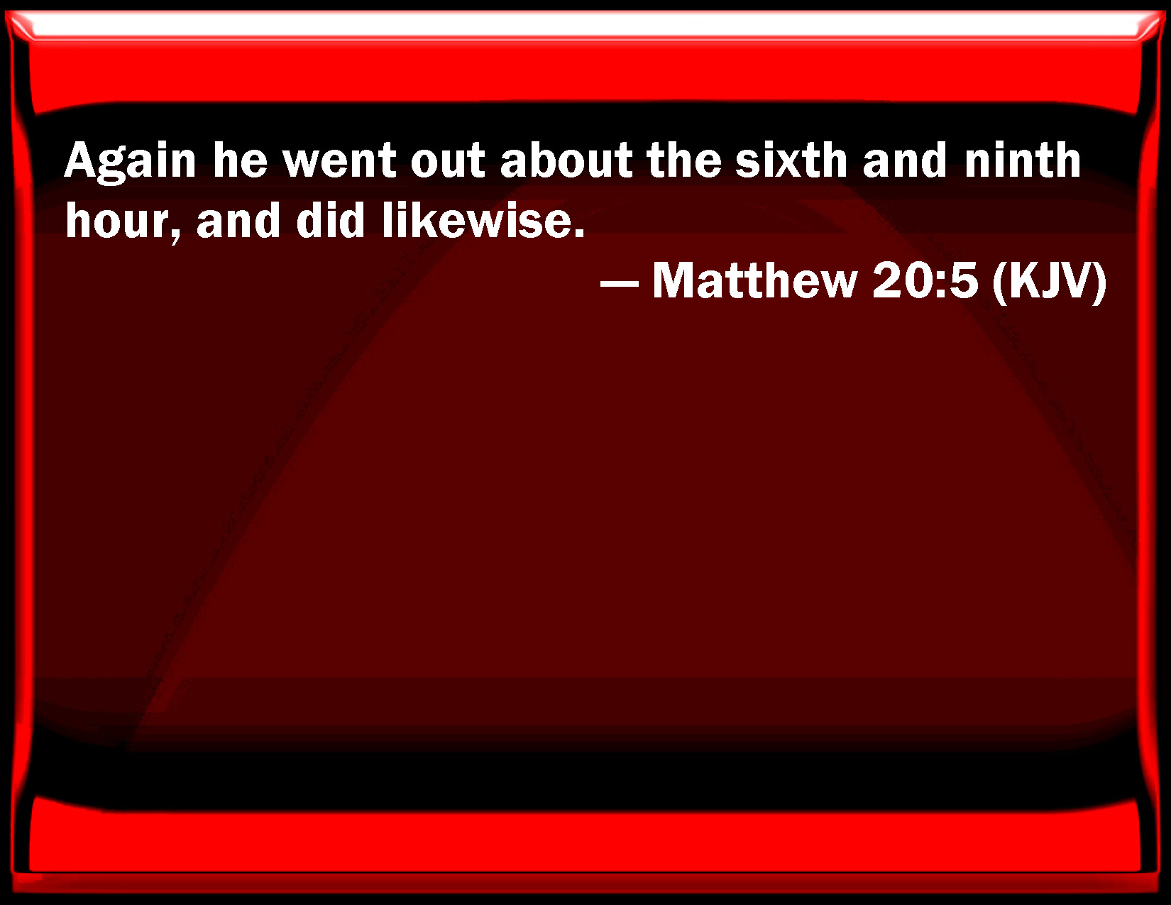 Bible Verse Slide Matthew 20:5 Again he went out about the sixth and ninth hour, and did likewise. KJV: Again he went out about the sixth and ninth hour, and did likewise. DRB: And they went their way. And again he went out about the sixth and the ninth hour, and did in like manner. DBT: Again, having gone out about the sixth and ninth hour, he did likewise. ERV: Again he went out about the sixth and the ninth hour, and did likewise. WBT: Again he went out about the sixth and ninth hour, and did likewise. WEB: Again he went out about the sixth and the ninth hour, and did likewise. YLT: and they went away. 'Again, having gone forth about the sixth and the ninth hour, he did in like manner.Links Matthew 20:5 NIV • Matthew 20:5 NLT • Matthew 20:5 ESV • Matthew 20:5 NASB • Matthew 20:5 KJV • Matthew 20:5 Interlinear • Matthew 20:5 Commentaries • Matthew 20:5 Parallel Texts • Matthew 20:5 Bible Apps • Matthew 20:5 Parallel • Bible Hub |