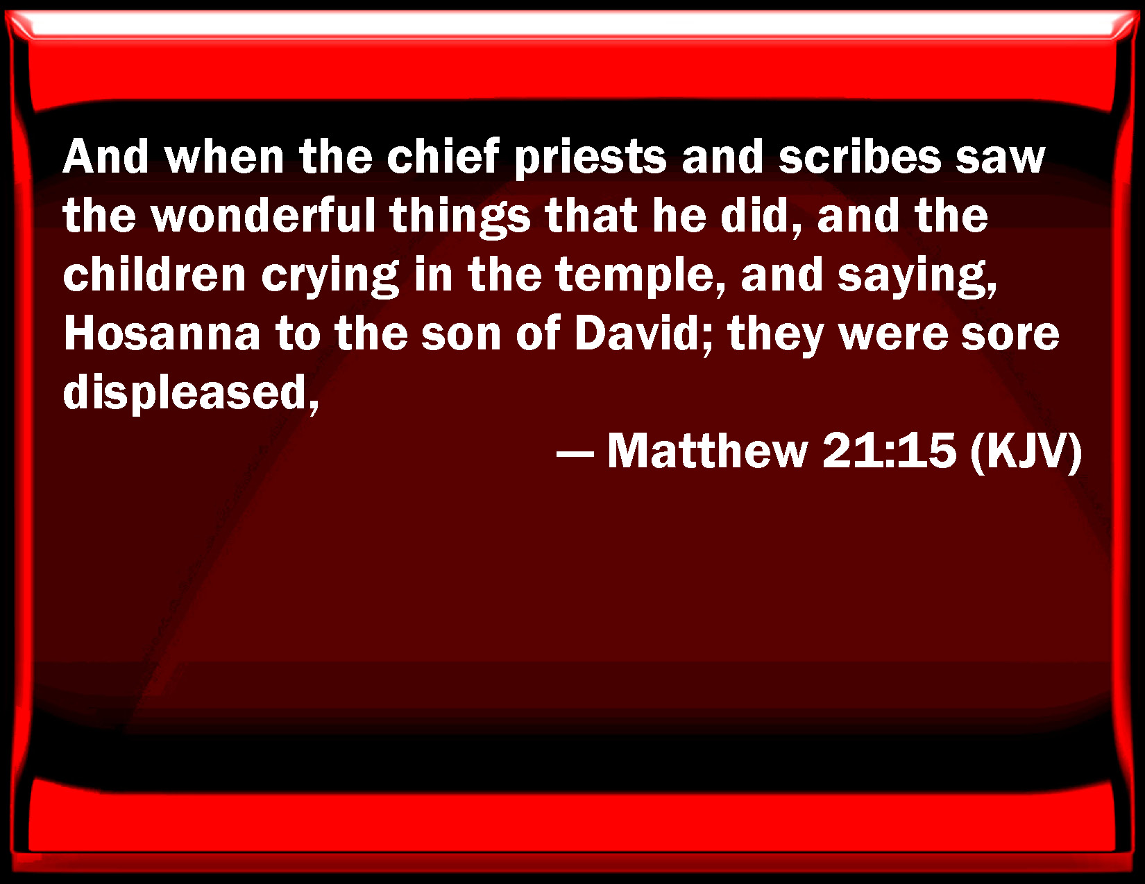 Bible Verse Slide Matthew 21:15 And when the chief priests and scribes saw the wonderful things that he did, and the children crying in the temple, and saying, Hosanna to the son of David; they were sore displeased, KJV: And when the chief priests and scribes saw the wonderful things that he did, and the children crying in the temple, and saying, Hosanna to the Son of David; they were sore displeased, DRB: And the chief priests and scribes, seeing the wonderful things that he did, and the children crying in the temple, and saying: Hosanna to the son of David; were moved with indignation. DBT: And when the chief priests and the scribes saw the wonders which he wrought, and the children crying in the temple and saying, Hosanna to the Son of David, they were indignant, ERV: But when the chief priests and the scribes saw the wonderful things that he did, and the children that were crying in the temple and saying, Hosanna to the son of David; they were moved with indignation, WBT: And when the chief priests and scribes saw the wonderful things that he did, and the children crying in the temple, and saying, Hosanna to the son of David; they were greatly displeased, WEB: But when the chief priests and the scribes saw the wonderful things that he did, and the children who were crying in the temple and saying, "Hosanna to the son of David!" they were indignant, YLT: and the chief priests and the scribes having seen the wonderful things that he did, and the children crying in the temple, and saying, 'Hosanna to the Son of David,' were much displeased;Links Matthew 21:15 NIV • Matthew 21:15 NLT • Matthew 21:15 ESV • Matthew 21:15 NASB • Matthew 21:15 KJV • Matthew 21:15 Interlinear • Matthew 21:15 Commentaries • Matthew 21:15 Parallel Texts • Matthew 21:15 Bible Apps • Matthew 21:15 Parallel • Bible Hub |