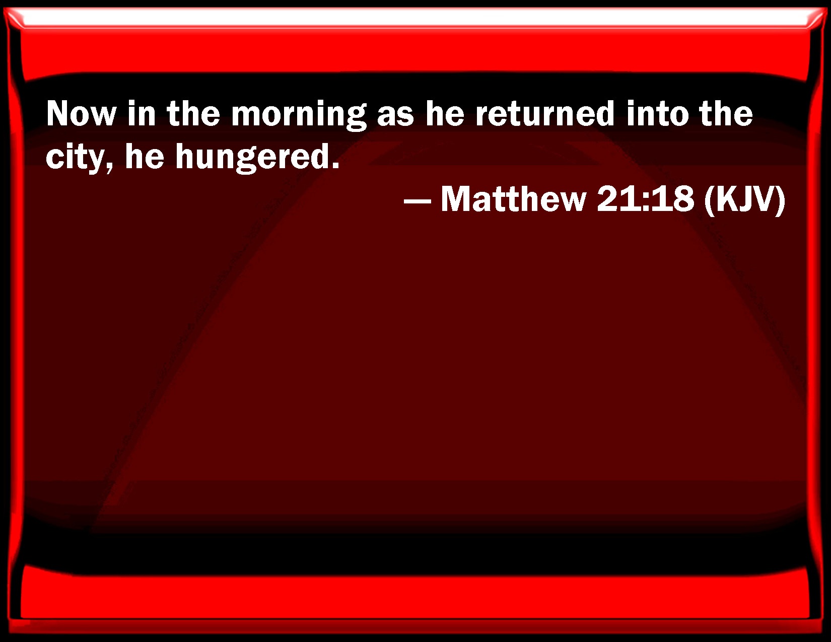 Bible Verse Slide Matthew 21:18 Now in the morning as he returned into the city, he hungry. KJV: Now in the morning as he returned into the city, he hungered. DRB: And in the morning, returning into the city, he was hungry. DBT: But early in the morning, as he came back into the city, he hungered. ERV: Now in the morning as he returned to the city, he hungered. WBT: Now in the morning as he was returning into the city, he was hungry. WEB: Now in the morning, as he returned to the city, he was hungry. YLT: and in the morning turning back to the city, he hungered,Links Matthew 21:18 NIV • Matthew 21:18 NLT • Matthew 21:18 ESV • Matthew 21:18 NASB • Matthew 21:18 KJV • Matthew 21:18 Interlinear • Matthew 21:18 Commentaries • Matthew 21:18 Parallel Texts • Matthew 21:18 Bible Apps • Matthew 21:18 Parallel • Bible Hub |