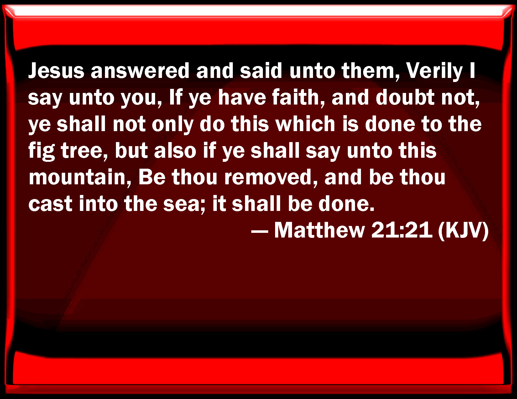 Bible Verse Slide Matthew 21:21 Jesus answered and said to them, Truly I say to you, If you have faith, and doubt not, you shall not only do this which is done to the fig tree, but also if you shall say to this mountain, Be you removed, and be you cast into the sea; it shall be done. KJV: Jesus answered and said unto them, Verily I say unto you, If ye have faith, and doubt not, ye shall not only do this which is done to the fig tree, but also if ye shall say unto this mountain, Be thou removed, and be thou cast into the sea; it shall be done. DRB: And Jesus answering, said to them: Amen, I say to you, if you shall have faith, and stagger not, not only this of the fig tree shall you do, but also if you shall say to this mountain, Take up and cast thyself into the sea, it shall be done. DBT: And Jesus answering said to them, Verily I say unto you, If ye have faith, and do not doubt, not only shall ye do what is done to the fig-tree, but even if ye should say to this mountain, Be thou taken away and be thou cast into the sea, it shall come to pass. ERV: And Jesus answered and said unto them, Verily I say unto you, If ye have faith, and doubt not, ye shall not only do what is done to the fig tree, but even if ye shall say unto this mountain, Be thou taken up and cast into the sea, it shall be done. WBT: Jesus answered and said to them, Verily I say to you, If ye have faith, and doubt not, ye shall not only do this which is done to the fig-tree, but also, if ye shall say to this mountain, Be thou removed, and be thou cast into the sea; it shall be done. WEB: Jesus answered them, "Most certainly I tell you, if you have faith, and don't doubt, you will not only do what was done to the fig tree, but even if you told this mountain, 'Be taken up and cast into the sea,' it would be done. YLT: And Jesus answering said to them, 'Verily I say to you, If ye may have faith, and may not doubt, not only this of the fig-tree shall ye do, but even if to this mount ye may say, Be lifted up and be cast into the sea, it shall come to pass;Links Matthew 21:21 NIV • Matthew 21:21 NLT • Matthew 21:21 ESV • Matthew 21:21 NASB • Matthew 21:21 KJV • Matthew 21:21 Interlinear • Matthew 21:21 Commentaries • Matthew 21:21 Parallel Texts • Matthew 21:21 Bible Apps • Matthew 21:21 Parallel • Bible Hub |