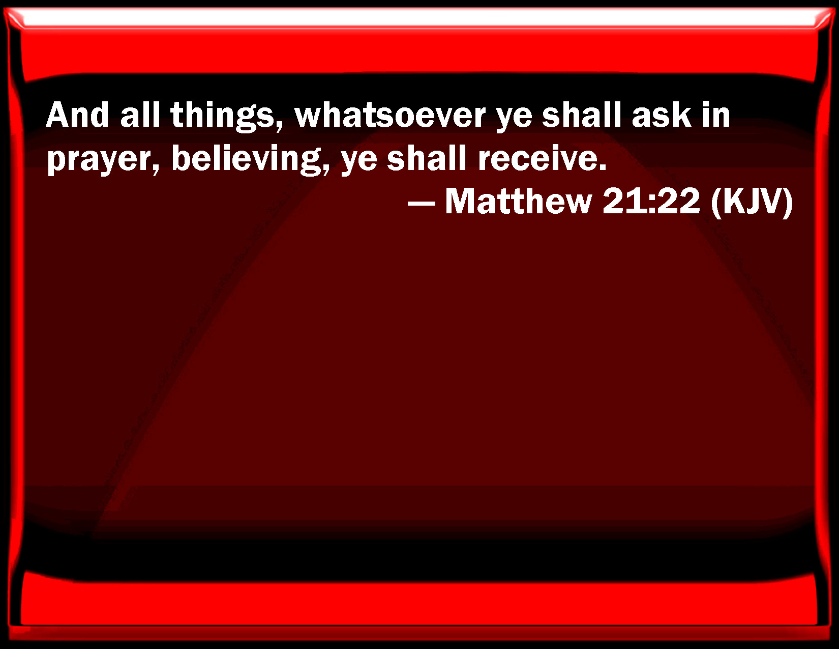 Bible Verse Slide Matthew 21:22 And all things, whatever you shall ask in prayer, believing, you shall receive. KJV: And all things, whatsoever ye shall ask in prayer, believing, ye shall receive. DRB: And in all things whatsoever you shall ask in prayer, believing, you shall receive. DBT: And all things whatsoever ye shall ask in prayer, believing, ye shall receive. ERV: And all things, whatsoever ye shall ask in prayer, believing, ye shall receive. WBT: And all things whatever ye shall ask in prayer, believing, ye shall receive. WEB: All things, whatever you ask in prayer, believing, you will receive." YLT: and all — as much as ye may ask in the prayer, believing, ye shall receive.'Links Matthew 21:22 NIV • Matthew 21:22 NLT • Matthew 21:22 ESV • Matthew 21:22 NASB • Matthew 21:22 KJV • Matthew 21:22 Interlinear • Matthew 21:22 Commentaries • Matthew 21:22 Parallel Texts • Matthew 21:22 Bible Apps • Matthew 21:22 Parallel • Bible Hub |