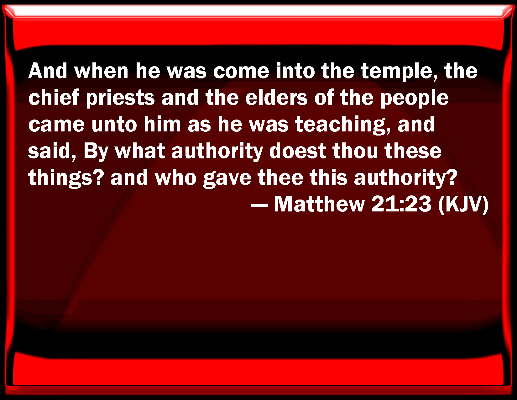 Bible Verse Slide Matthew 21:23 And when he was come into the temple, the chief priests and the elders of the people came to him as he was teaching, and said, By what authority do you these things? and who gave you this authority? KJV: And when he was come into the temple, the chief priests and the elders of the people came unto him as he was teaching, and said, By what authority doest thou these things? and who gave thee this authority? DRB: And when he was come into the temple, there came to him, as he was teaching, the chief priests and ancients of the people, saying: By what authority dost thou these things? and who hath given thee this authority? DBT: And when he came into the temple, the chief priests and the elders of the people came to him as he was teaching, saying, By what authority doest thou these things? and who gave thee this authority? ERV: And when he was come into the temple, the chief priests and the elders of the people came unto him as he was teaching, and said, By what authority doest thou these things? and who gave thee this authority? WBT: And when he had come into the temple, the chief priests and the elders of the people came to him as he was teaching, and said, By what authority doest thou these things; and who gave thee this authority? WEB: When he had come into the temple, the chief priests and the elders of the people came to him as he was teaching, and said, "By what authority do you do these things? Who gave you this authority?" YLT: And he having come to the temple, there came to him when teaching the chief priests and the elders of the people, saying, 'By what authority dost thou do these things? and who gave thee this authority?'Links Matthew 21:23 NIV • Matthew 21:23 NLT • Matthew 21:23 ESV • Matthew 21:23 NASB • Matthew 21:23 KJV • Matthew 21:23 Interlinear • Matthew 21:23 Commentaries • Matthew 21:23 Parallel Texts • Matthew 21:23 Bible Apps • Matthew 21:23 Parallel • Bible Hub |