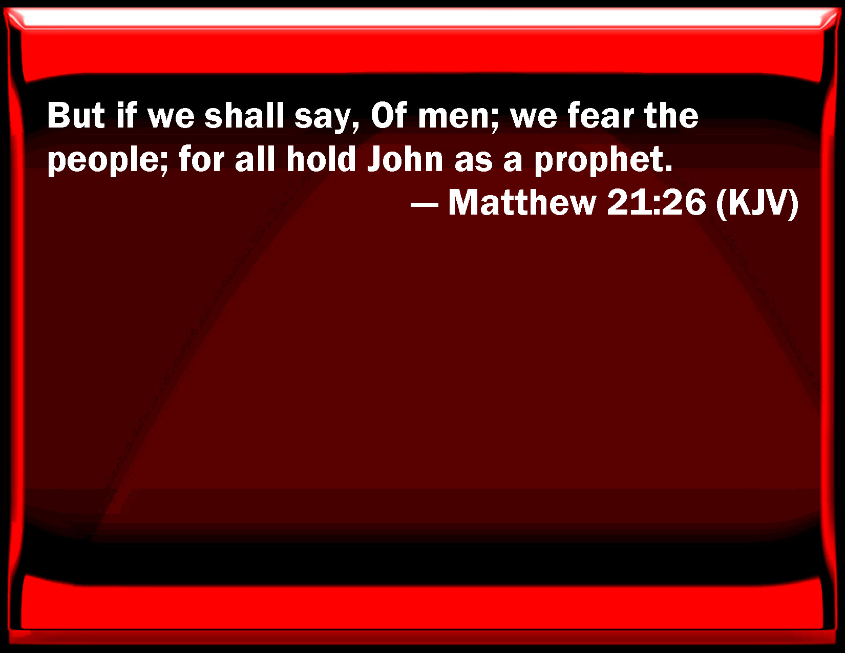 Bible Verse Slide Matthew 21:26 But if we shall say, Of men; we fear the people; for all hold John as a prophet. KJV: But if we shall say, Of men; we fear the people; for all hold John as a prophet. DRB: If we shall say, from heaven, he will say to us: Why then did you not believe him? But if we shall say, from men, we are afraid of the multitude: for all held John as a prophet. DBT: but if we should say, Of men, we fear the crowd, for all hold John for a prophet. ERV: But if we shall say, From men; we fear the multitude; for all hold John as a prophet. WBT: But if we shall say, From men; we fear the people: for all hold John as a prophet. WEB: But if we say, 'From men,' we fear the multitude, for all hold John as a prophet." YLT: and if we should say, From men, we fear the multitude, for all hold John as a prophet.'Links Matthew 21:26 NIV • Matthew 21:26 NLT • Matthew 21:26 ESV • Matthew 21:26 NASB • Matthew 21:26 KJV • Matthew 21:26 Interlinear • Matthew 21:26 Commentaries • Matthew 21:26 Parallel Texts • Matthew 21:26 Bible Apps • Matthew 21:26 Parallel • Bible Hub |