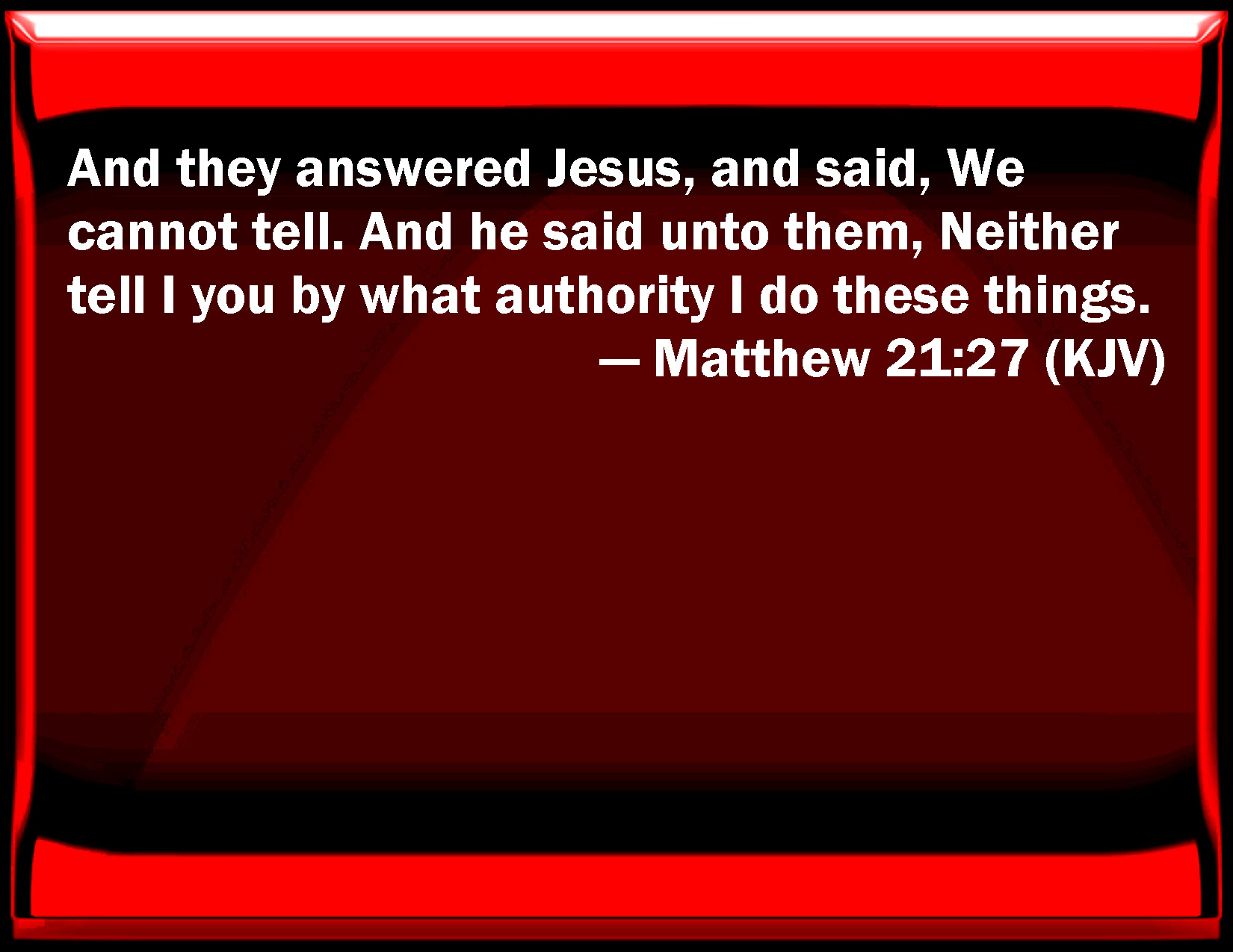 Bible Verse Slide Matthew 21:27 And they answered Jesus, and said, We cannot tell. And he said to them, Neither tell I you by what authority I do these things. KJV: And they answered Jesus, and said, We cannot tell. And he said unto them, Neither tell I you by what authority I do these things. DRB: And answering Jesus, they said: We know not. He also said to them: Neither do I tell you by what authority I do these things. DBT: And answering Jesus they said, We do not know. He also said to them, Neither do I tell you by what authority I do these things. ERV: And they answered Jesus, and said, We know not. He also said unto them, Neither tell I you by what authority I do these things. WBT: And they answered Jesus, and said, We cannot tell. And he said to them, Neither do I tell you by what authority I do these things. WEB: They answered Jesus, and said, "We don't know." He also said to them, "Neither will I tell you by what authority I do these things. YLT: And answering Jesus they said, 'We have not known.' He said to them — he also — 'Neither do I tell you by what authority I do these things.Links Matthew 21:27 NIV • Matthew 21:27 NLT • Matthew 21:27 ESV • Matthew 21:27 NASB • Matthew 21:27 KJV • Matthew 21:27 Interlinear • Matthew 21:27 Commentaries • Matthew 21:27 Parallel Texts • Matthew 21:27 Bible Apps • Matthew 21:27 Parallel • Bible Hub |