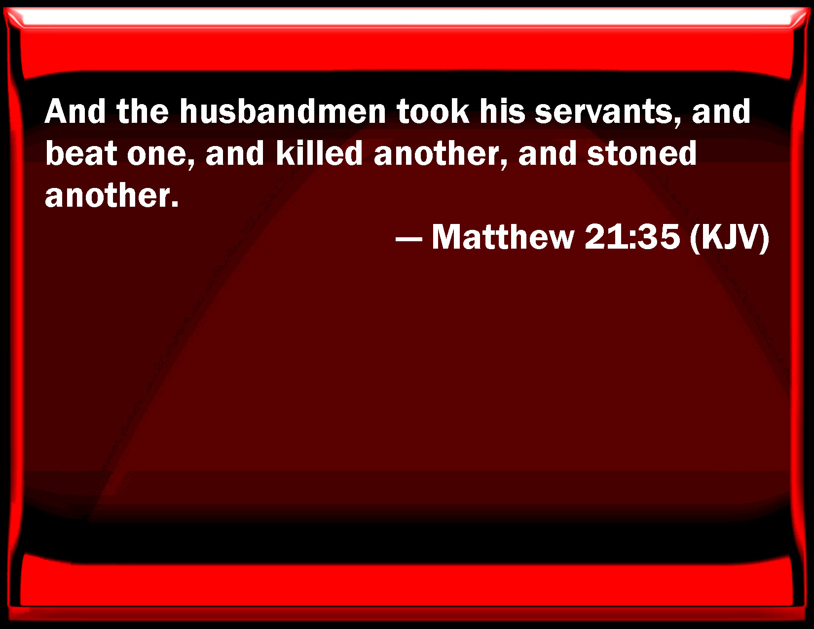 Bible Verse Slide Matthew 21:35 And the farmers took his servants, and beat one, and killed another, and stoned another. KJV: And the husbandmen took his servants, and beat one, and killed another, and stoned another. DRB: And the husbandmen laying hands on his servants, beat one, and killed another, and stoned another. DBT: And the husbandmen took his bondmen, and beat one, killed another, and stoned another. ERV: And the husbandmen took his servants, and beat one, and killed another, and stoned another. WBT: And the husbandmen took his servants, and beat one, and killed another, and stoned another. WEB: The farmers took his servants, beat one, killed another, and stoned another. YLT: and the husbandmen having taken his servants, one they scourged, and one they killed, and one they stoned.Links Matthew 21:35 NIV • Matthew 21:35 NLT • Matthew 21:35 ESV • Matthew 21:35 NASB • Matthew 21:35 KJV • Matthew 21:35 Interlinear • Matthew 21:35 Commentaries • Matthew 21:35 Parallel Texts • Matthew 21:35 Bible Apps • Matthew 21:35 Parallel • Bible Hub |