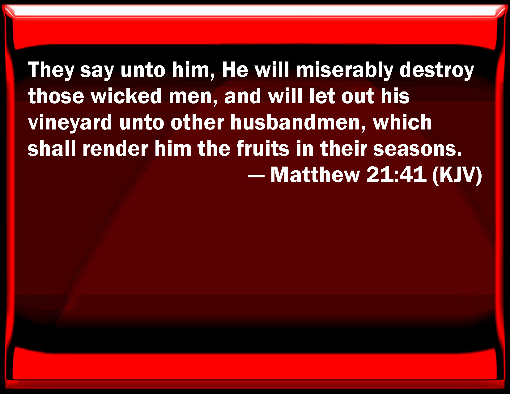 Bible Verse Slide Matthew 21:41 They say to him, He will miserably destroy those wicked men, and will let out his vineyard to other farmers, which shall render him the fruits in their seasons. KJV: They say unto him, He will miserably destroy those wicked men, and will let out his vineyard unto other husbandmen, which shall render him the fruits in their seasons. DRB: They say to him: He will bring those evil men to an evil end; and will let out his vineyard to other husbandmen, that shall render him the fruit in due season. DBT: They say to him, He will miserably destroy those evil men, and let out the vineyard to other husbandmen, who shall render him the fruits in their seasons. ERV: They say unto him, He will miserably destroy those miserable men, and will let out the vineyard unto other husbandmen, which shall render him the fruits in their seasons. WBT: They say to him, He will miserably destroy those wicked men, and will let out his vineyard to other husbandmen, who will render him the fruits in their seasons. WEB: They told him, "He will miserably destroy those miserable men, and will lease out the vineyard to other farmers, who will give him the fruit in its season." YLT: They say to him, 'Evil men — he will evilly destroy them, and the vineyard will give out to other husbandmen, who will give back to him the fruits in their seasons.'Links Matthew 21:41 NIV • Matthew 21:41 NLT • Matthew 21:41 ESV • Matthew 21:41 NASB • Matthew 21:41 KJV • Matthew 21:41 Interlinear • Matthew 21:41 Commentaries • Matthew 21:41 Parallel Texts • Matthew 21:41 Bible Apps • Matthew 21:41 Parallel • Bible Hub |