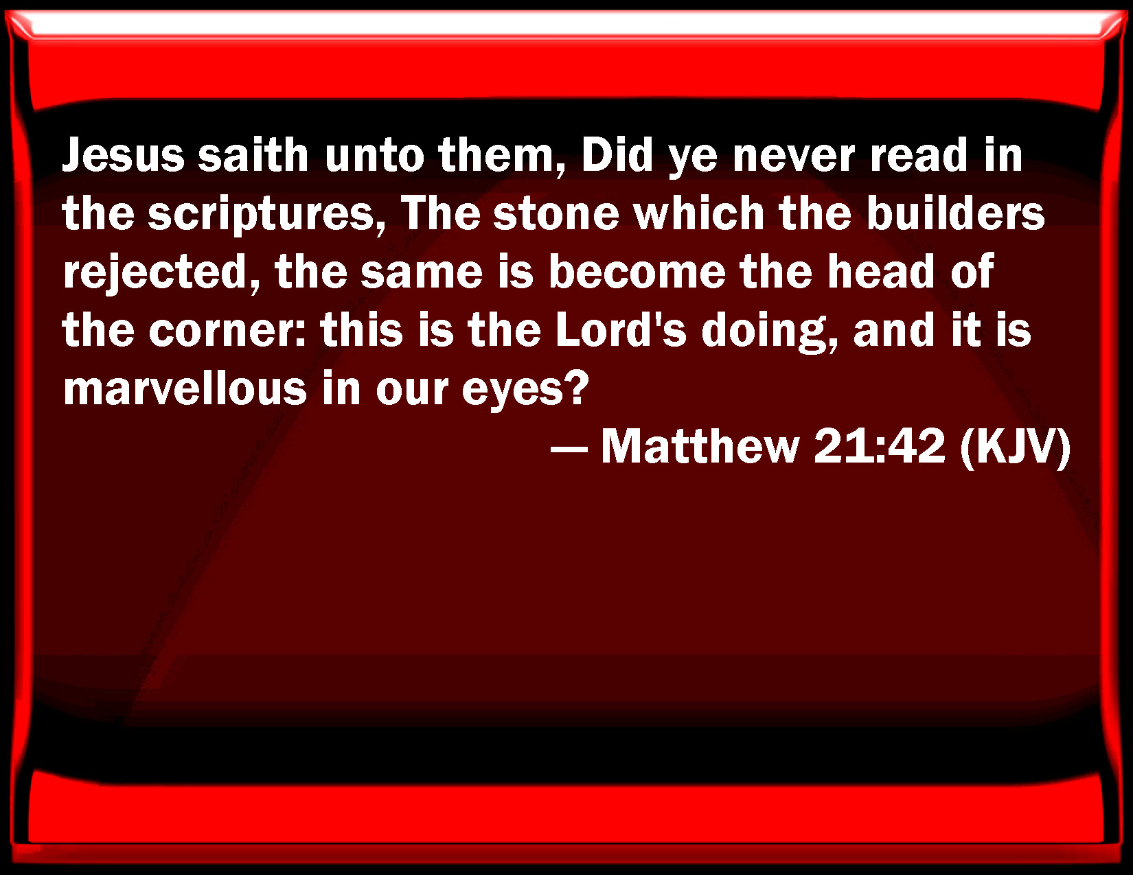 Bible Verse Slide Matthew 21:42 Jesus said to them, Did you never read in the scriptures, The stone which the builders rejected, the same is become the head of the corner: this is the Lord's doing, and it is marvelous in our eyes? KJV: Jesus saith unto them, Did ye never read in the scriptures, The stone which the builders rejected, the same is become the head of the corner: this is the Lord's doing, and it is marvellous in our eyes? DRB: Jesus saith to them: Have you never read in the Scriptures: The stone which the builders rejected, the same is become the head of the corner? By the Lord this has been done; and it is wonderful in our eyes. DBT: Jesus says to them, Have ye never read in the scriptures, The stone which they that builded rejected, this has become the corner-stone: this is of the Lord, and it is wonderful in our eyes? ERV: Jesus saith unto them, Did ye never read in the scriptures, The stone which the builders rejected, The same was made the head of the corner: This was from the Lord, And it is marvelous in our eyes? WBT: Jesus saith to them, Did ye never read in the scriptures, The stone which the builders rejected, the same is become the head of the corner: this is the Lord's doing, and it is marvelous in our eyes? WEB: Jesus said to them, "Did you never read in the Scriptures, 'The stone which the builders rejected, the same was made the head of the corner. This was from the Lord. It is marvelous in our eyes?' YLT: Jesus saith to them, 'Did ye never read in the Writings, A stone that the builders disallowed, it became head of a corner; from the Lord hath this come to pass, and it is wonderful in our eyes.Links Matthew 21:42 NIV • Matthew 21:42 NLT • Matthew 21:42 ESV • Matthew 21:42 NASB • Matthew 21:42 KJV • Matthew 21:42 Interlinear • Matthew 21:42 Commentaries • Matthew 21:42 Parallel Texts • Matthew 21:42 Bible Apps • Matthew 21:42 Parallel • Bible Hub |