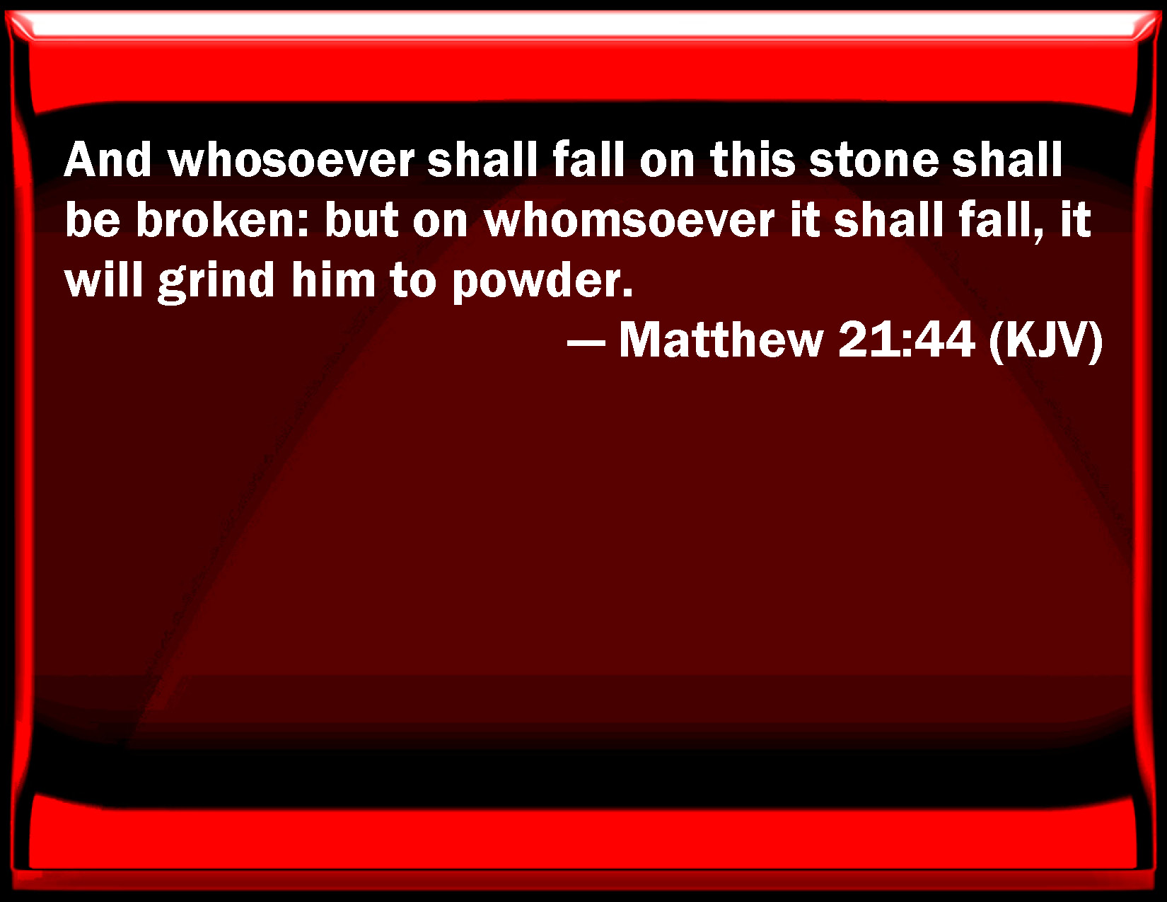 Bible Verse Slide Matthew 21:44 And whoever shall fall on this stone shall be broken: but on whomsoever it shall fall, it will grind him to powder. KJV: And whosoever shall fall on this stone shall be broken: but on whomsoever it shall fall, it will grind him to powder. DRB: And whosoever shall fall on this stone, shall be broken: but on whomsoever it shall fall, it shall grind him to powder. DBT: And he that falls on this stone shall be broken, but on whomsoever it shall fall, it shall grind him to powder. ERV: And he that falleth on this stone shall be broken to pieces: but on whomsoever it shall fall, it will scatter him as dust. WBT: And whoever shall fall on this stone, shall be broken: but on whomsoever it shall fall, it will grind him to powder. WEB: He who falls on this stone will be broken to pieces, but on whoever it will fall, it will scatter him as dust." YLT: and he who is falling on this stone shall be broken, and on whomsoever it may fall it will crush him to pieces.'Links Matthew 21:44 NIV • Matthew 21:44 NLT • Matthew 21:44 ESV • Matthew 21:44 NASB • Matthew 21:44 KJV • Matthew 21:44 Interlinear • Matthew 21:44 Commentaries • Matthew 21:44 Parallel Texts • Matthew 21:44 Bible Apps • Matthew 21:44 Parallel • Bible Hub |