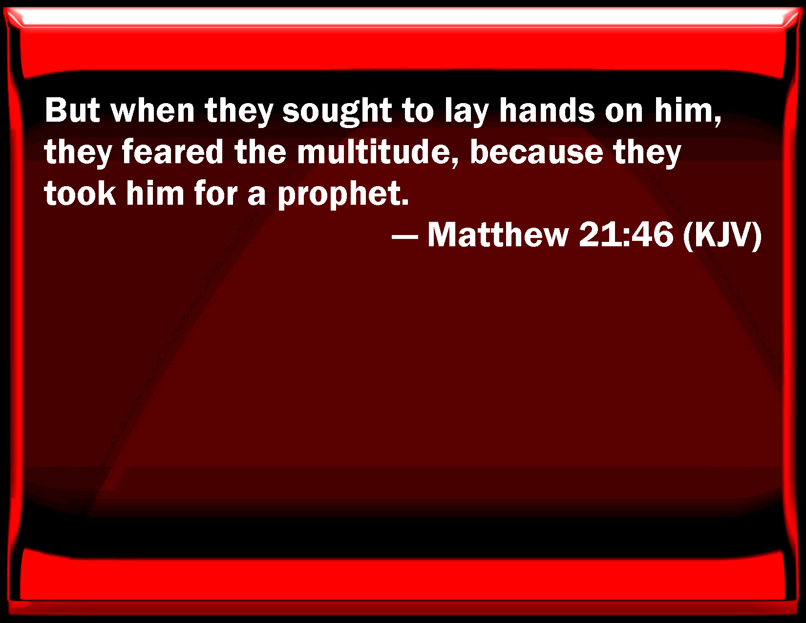 Bible Verse Slide Matthew 21:46 But when they sought to lay hands on him, they feared the multitude, because they took him for a prophet. KJV: But when they sought to lay hands on him, they feared the multitude, because they took him for a prophet. DRB: And seeking to lay hands on him, they feared the multitudes: because they held him as a prophet. DBT: And seeking to lay hold of him, they were afraid of the crowds, because they held him for a prophet. ERV: And when they sought to lay hold on him, they feared the multitudes, because they took him for a prophet. WBT: But when they sought to lay hands on him, they feared the multitude, because they took him for a prophet. WEB: When they sought to seize him, they feared the multitudes, because they considered him to be a prophet. YLT: and seeking to lay hold on him, they feared the multitudes, seeing they were holding him as a prophet.Links Matthew 21:46 NIV • Matthew 21:46 NLT • Matthew 21:46 ESV • Matthew 21:46 NASB • Matthew 21:46 KJV • Matthew 21:46 Interlinear • Matthew 21:46 Commentaries • Matthew 21:46 Parallel Texts • Matthew 21:46 Bible Apps • Matthew 21:46 Parallel • Bible Hub |