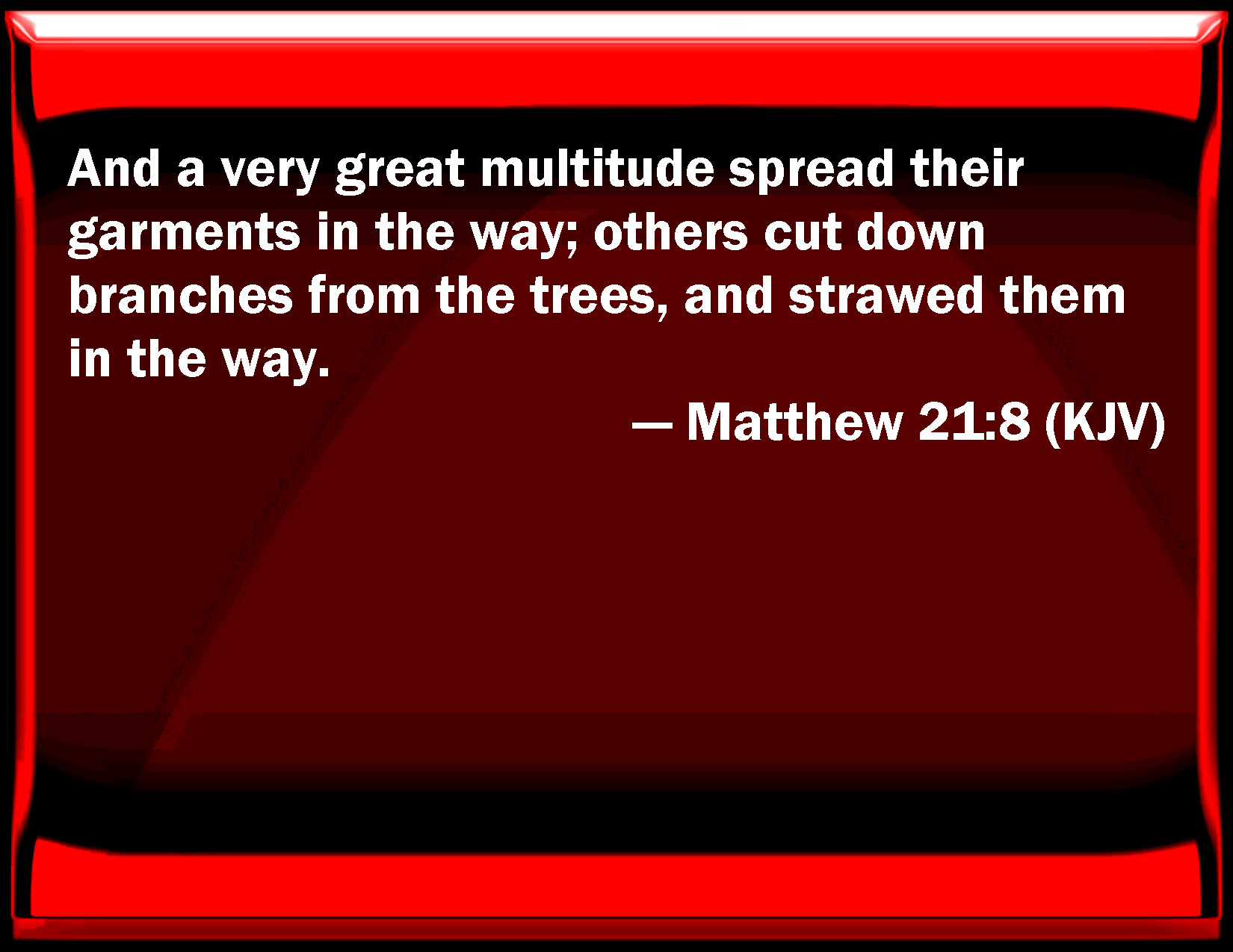 Bible Verse Slide Matthew 21:8 And a very great multitude spread their garments in the way; others cut down branches from the trees, and strewed them in the way. KJV: And a very great multitude spread their garments in the way; others cut down branches from the trees, and strawed them in the way. DRB: And a very great multitude spread their garments in the way: and others cut boughs from the trees, and strewed them in the way: DBT: But a very great crowd strewed their own garments on the way, and others kept cutting down branches from the trees and strewing them on the way. ERV: And the most part of the multitude spread their garments in the way; and others cut branches from the trees, and spread them in the way. WBT: And a very great multitude spread their garments in the way; others cut down branches from the trees, and strewed them in the way. WEB: A very great multitude spread their clothes on the road. Others cut branches from the trees, and spread them on the road. YLT: and the very great multitude spread their own garments in the way, and others were cutting branches from the trees, and were strewing in the way,Links Matthew 21:8 NIV • Matthew 21:8 NLT • Matthew 21:8 ESV • Matthew 21:8 NASB • Matthew 21:8 KJV • Matthew 21:8 Interlinear • Matthew 21:8 Commentaries • Matthew 21:8 Parallel Texts • Matthew 21:8 Bible Apps • Matthew 21:8 Parallel • Bible Hub |