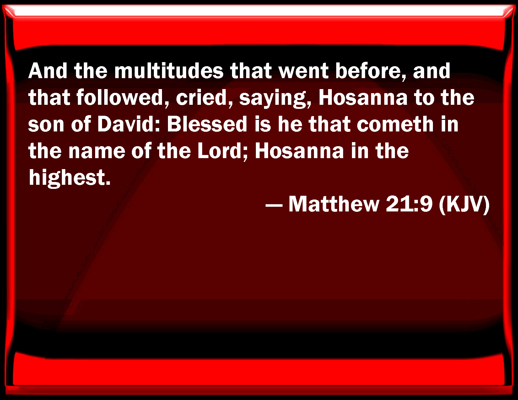 Bible Verse Slide Matthew 21:9 And the multitudes that went before, and that followed, cried, saying, Hosanna to the son of David: Blessed is he that comes in the name of the Lord; Hosanna in the highest. KJV: And the multitudes that went before, and that followed, cried, saying, Hosanna to the Son of David: Blessed is he that cometh in the name of the Lord; Hosanna in the highest. DRB: And the multitudes that went before and that followed, cried, saying: Hosanna to the son of David: Blessed is he that cometh in the name of the Lord: Hosanna in the highest. DBT: And the crowds who went before him and who followed cried, saying, Hosanna to the Son of David; blessed be he who comes in the name of the Lord; hosanna in the highest. ERV: And the multitudes that went before him, and that followed, cried, saying, Hosanna to the son of David: Blessed is he that cometh in the name of the Lord; Hosanna in the highest. WBT: And the multitudes that went before, and that followed, cried, saying, Hosanna to the son of David: blessed is he that cometh in the name of the Lord: Hosanna in the highest. WEB: The multitudes who went before him, and who followed kept shouting, "Hosanna to the son of David! Blessed is he who comes in the name of the Lord! Hosanna in the highest!" YLT: and the multitudes who were going before, and who were following, were crying, saying, 'Hosanna to the Son of David, blessed is he who is coming in the name of the Lord; Hosanna in the highest.'Links Matthew 21:9 NIV • Matthew 21:9 NLT • Matthew 21:9 ESV • Matthew 21:9 NASB • Matthew 21:9 KJV • Matthew 21:9 Interlinear • Matthew 21:9 Commentaries • Matthew 21:9 Parallel Texts • Matthew 21:9 Bible Apps • Matthew 21:9 Parallel • Bible Hub |