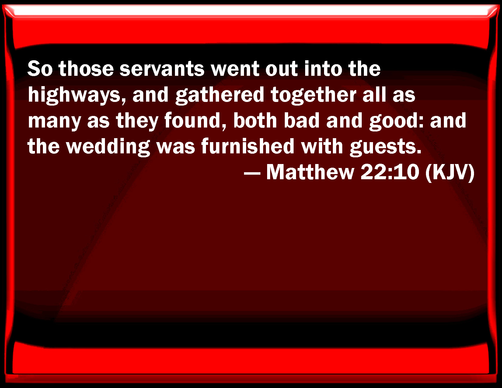 Bible Verse Slide Matthew 22:10 So those servants went out into the highways, and gathered together all as many as they found, both bad and good: and the wedding was furnished with guests. KJV: So those servants went out into the highways, and gathered together all as many as they found, both bad and good: and the wedding was furnished with guests. DRB: And his servants going forth into the ways, gathered together all that they found, both bad and good: and the marriage was filled with guests. DBT: And those bondmen went out into the highways, and brought together all as many as they found, both evil and good; and the wedding feast was furnished with guests. ERV: And those servants went out into the highways, and gathered together all as many as they found, both bad and good: and the wedding was filled with guests. WBT: So those servants went out into the highways, and collected all as many as they found, both bad and good: and the wedding was furnished with guests. WEB: Those servants went out into the highways, and gathered together as many as they found, both bad and good. The wedding was filled with guests. YLT: 'And those servants, having gone forth to the ways, did gather all, as many as they found, both bad and good, and the marriage-feast apartment was filled with those reclining.Links Matthew 22:10 NIV • Matthew 22:10 NLT • Matthew 22:10 ESV • Matthew 22:10 NASB • Matthew 22:10 KJV • Matthew 22:10 Interlinear • Matthew 22:10 Commentaries • Matthew 22:10 Parallel Texts • Matthew 22:10 Bible Apps • Matthew 22:10 Parallel • Bible Hub |