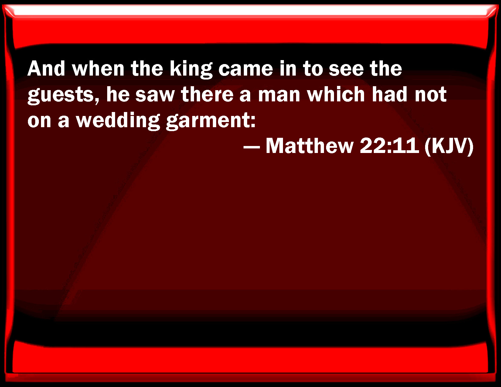 Bible Verse Slide Matthew 22:11 And when the king came in to see the guests, he saw there a man which had not on a wedding garment: KJV: And when the king came in to see the guests, he saw there a man which had not on a wedding garment: DRB: And the king went in to see the guests: and he saw there a man who had not on a wedding garment. DBT: And the king, having gone in to see the guests, beheld there a man not clothed with a wedding garment. ERV: But when the king came in to behold the guests, he saw there a man which had not on a wedding-garment: WBT: And when the king came in to see the guests, he saw there a man who had not a wedding-garment: WEB: But when the king came in to see the guests, he saw there a man who didn't have on wedding clothing, YLT: 'And the king having come in to view those reclining, saw there a man not clothed with clothing of the marriage-feast,Links Matthew 22:11 NIV • Matthew 22:11 NLT • Matthew 22:11 ESV • Matthew 22:11 NASB • Matthew 22:11 KJV • Matthew 22:11 Interlinear • Matthew 22:11 Commentaries • Matthew 22:11 Parallel Texts • Matthew 22:11 Bible Apps • Matthew 22:11 Parallel • Bible Hub |
