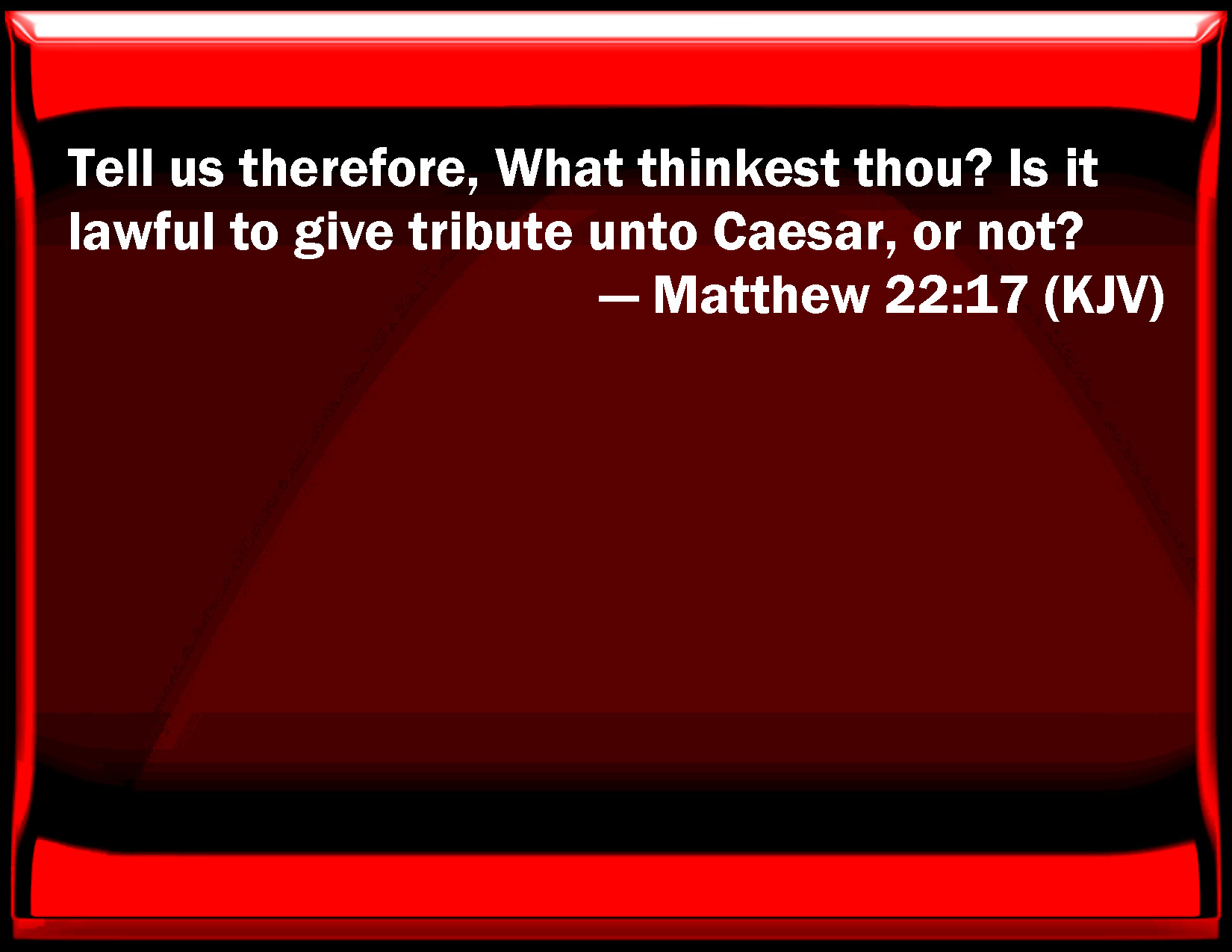 Bible Verse Slide Matthew 22:17 Tell us therefore, What think you? Is it lawful to give tribute to Caesar, or not? KJV: Tell us therefore, What thinkest thou? Is it lawful to give tribute unto Caesar, or not? DRB: Tell us therefore what dost thou think, is it lawful to give tribute to Caesar, or not? DBT: tell us therefore what thou thinkest: Is it lawful to give tribute to Caesar, or not? ERV: Tell us therefore, What thinkest thou? Is it lawful to give tribute unto Caesar, or not? WBT: Tell us therefore, What thinkest thou? Is it lawful to give tribute to Cesar, or not? WEB: Tell us therefore, what do you think? Is it lawful to pay taxes to Caesar, or not?" YLT: tell us, therefore, what dost thou think? is it lawful to give tribute to Caesar or not?'Links Matthew 22:17 NIV • Matthew 22:17 NLT • Matthew 22:17 ESV • Matthew 22:17 NASB • Matthew 22:17 KJV • Matthew 22:17 Interlinear • Matthew 22:17 Commentaries • Matthew 22:17 Parallel Texts • Matthew 22:17 Bible Apps • Matthew 22:17 Parallel • Bible Hub |