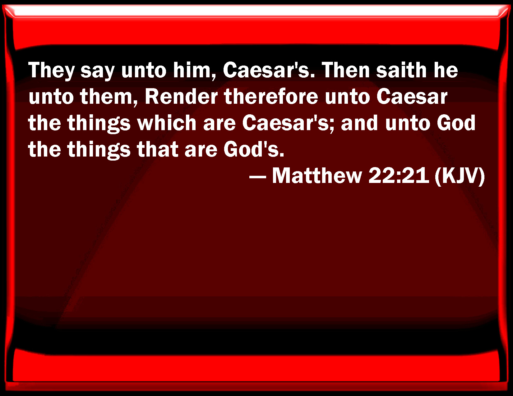 Bible Verse Slide Matthew 22:21 They say to him, Caesar's. Then said he to them, Render therefore to Caesar the things which are Caesar's; and to God the things that are God's. KJV: They say unto him, Caesar's. Then saith he unto them, Render therefore unto Caesar the things which are Caesar's; and unto God the things that are God's. DRB: They say to him: Caesar's. Then he saith to them: Render therefore to Caesar the things that are Caesar's; and to God, the things that are God's. DBT: They say to him, Caesar's. Then he says to them, Pay then what is Caesar's to Caesar, and what is God's to God. ERV: They say unto him, Caesar's. Then saith he unto them, Render therefore unto Caesar the things that are Caesar's; and unto God the things that are God's. WBT: They say to him, Cesar's. Then saith he to them, Render therefore to Cesar, the things which are Cesar's; and to God, the things that are God's. WEB: They said to him, "Caesar's." Then he said to them, "Give therefore to Caesar the things that are Caesar's, and to God the things that are God's." YLT: they say to him, 'Caesar's;' then saith he to them, 'Render therefore the things of Caesar to Caesar, and the things of God to God;'Links Matthew 22:21 NIV • Matthew 22:21 NLT • Matthew 22:21 ESV • Matthew 22:21 NASB • Matthew 22:21 KJV • Matthew 22:21 Interlinear • Matthew 22:21 Commentaries • Matthew 22:21 Parallel Texts • Matthew 22:21 Bible Apps • Matthew 22:21 Parallel • Bible Hub |