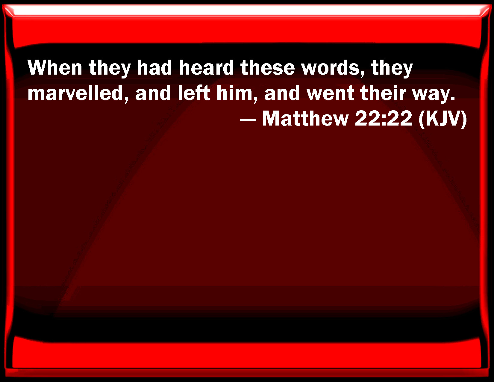 Bible Verse Slide Matthew 22:22 When they had heard these words, they marveled, and left him, and went their way. KJV: When they had heard these words, they marvelled, and left him, and went their way. DRB: And hearing this they wondered, and leaving him, went their ways. DBT: And when they heard him, they wondered, and left him, and went away. ERV: And when they heard it, they marveled, and left him, and went their way. WBT: When they had heard these words, they marveled, and left him, and departed. WEB: When they heard it, they marveled, and left him, and went away. YLT: and having heard they wondered, and having left him they went away.Links Matthew 22:22 NIV • Matthew 22:22 NLT • Matthew 22:22 ESV • Matthew 22:22 NASB • Matthew 22:22 KJV • Matthew 22:22 Interlinear • Matthew 22:22 Commentaries • Matthew 22:22 Parallel Texts • Matthew 22:22 Bible Apps • Matthew 22:22 Parallel • Bible Hub |