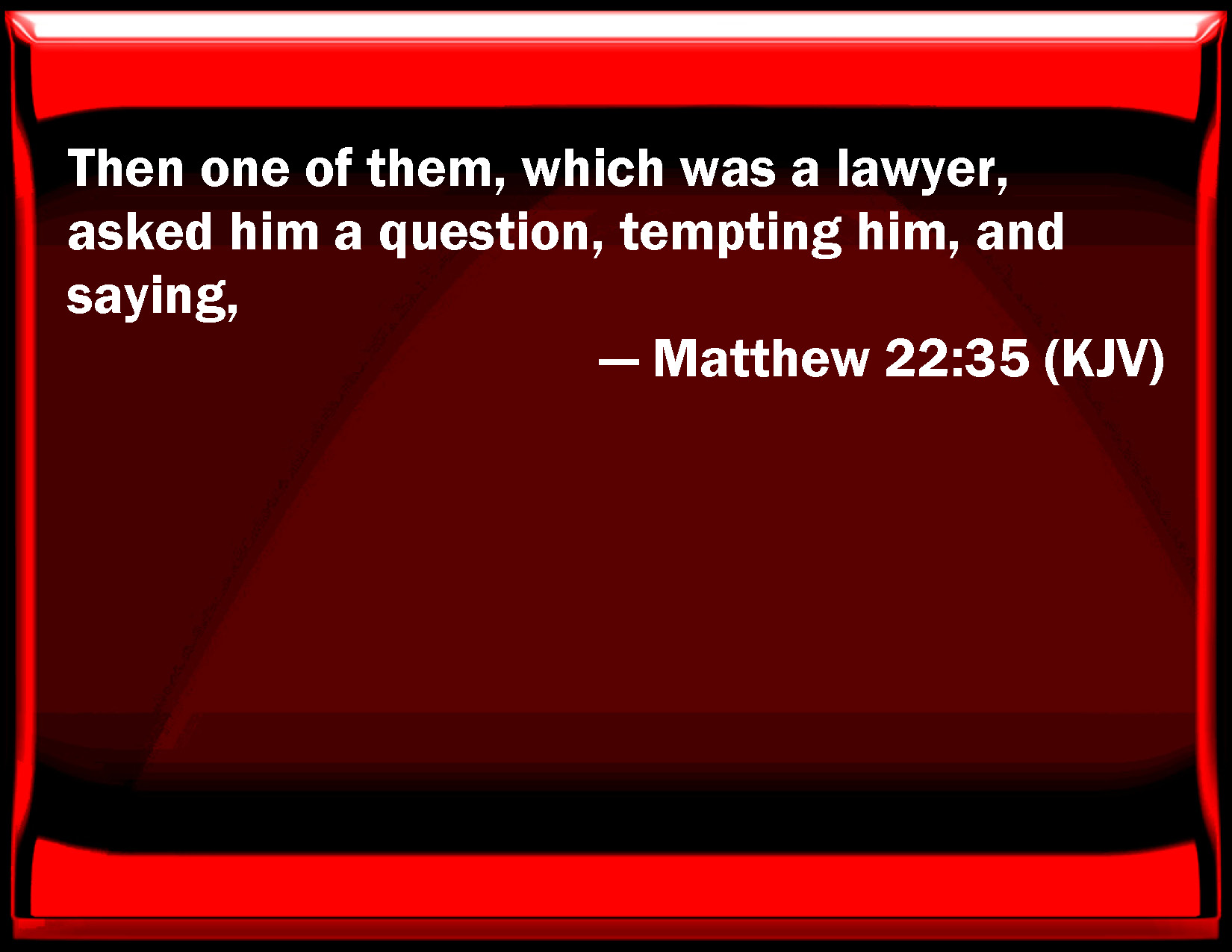 Bible Verse Slide Matthew 22:35 Then one of them, which was a lawyer, asked him a question, tempting him, and saying, KJV: Then one of them, which was a lawyer, asked him a question, tempting him, and saying, DRB: And one of them, a doctor of the law, asking him, tempting him: DBT: And one of them, a lawyer, demanded, tempting him, and saying, ERV: And one of them, a lawyer, asked him a question, tempting him, WBT: Then one of them who was a lawyer, asked him a question, tempting him, and saying, WEB: One of them, a lawyer, asked him a question, testing him. YLT: and one of them, a lawyer, did question, tempting him, and saying,Links Matthew 22:35 NIV • Matthew 22:35 NLT • Matthew 22:35 ESV • Matthew 22:35 NASB • Matthew 22:35 KJV • Matthew 22:35 Interlinear • Matthew 22:35 Commentaries • Matthew 22:35 Parallel Texts • Matthew 22:35 Bible Apps • Matthew 22:35 Parallel • Bible Hub |