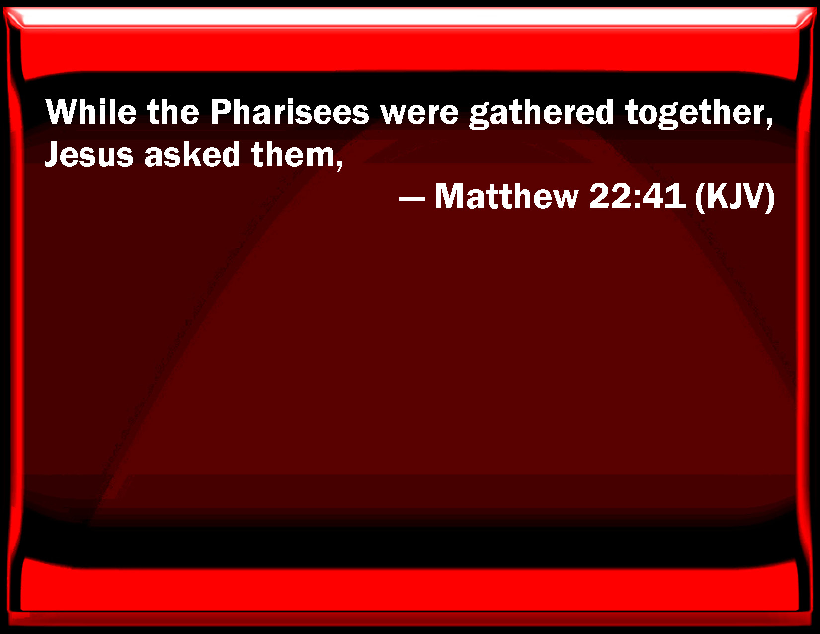 Bible Verse Slide Matthew 22:41 While the Pharisees were gathered together, Jesus asked them, KJV: While the Pharisees were gathered together, Jesus asked them, DRB: And the Pharisees being gathered together, Jesus asked them, DBT: And the Pharisees being gathered together, Jesus demanded of them, ERV: Now while the Pharisees were gathered together, Jesus asked them a question, WBT: While the Pharisees were assembled, Jesus asked them, WEB: Now while the Pharisees were gathered together, Jesus asked them a question, YLT: And the Pharisees having been gathered together, Jesus did question them,Links Matthew 22:41 NIV • Matthew 22:41 NLT • Matthew 22:41 ESV • Matthew 22:41 NASB • Matthew 22:41 KJV • Matthew 22:41 Interlinear • Matthew 22:41 Commentaries • Matthew 22:41 Parallel Texts • Matthew 22:41 Bible Apps • Matthew 22:41 Parallel • Bible Hub |