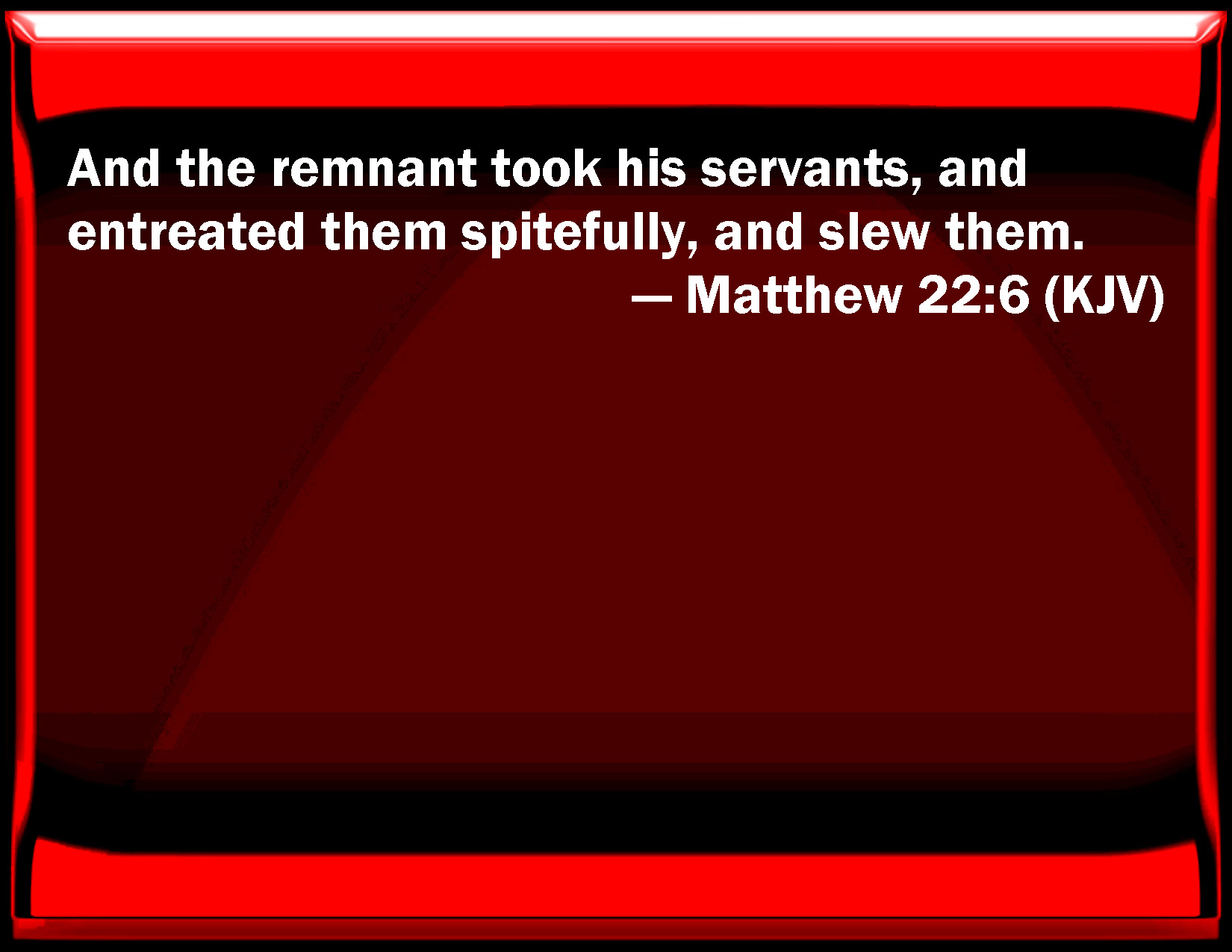 Bible Verse Slide Matthew 22:6 And the remnant took his servants, and entreated them spitefully, and slew them. KJV: And the remnant took his servants, and entreated them spitefully, and slew them. DRB: And the rest laid hands on his servants, and having treated them contumeliously, put them to death. DBT: And the rest, laying hold of his bondmen, ill-treated and slew them. ERV: and the rest laid hold on his servants, and entreated them shamefully, and killed them. WBT: And the remnant took his servants, and treated them spitefully, and slew them. WEB: and the rest grabbed his servants, and treated them shamefully, and killed them. YLT: and the rest, having laid hold on his servants, did insult and slay them.Links Matthew 22:6 NIV • Matthew 22:6 NLT • Matthew 22:6 ESV • Matthew 22:6 NASB • Matthew 22:6 KJV • Matthew 22:6 Interlinear • Matthew 22:6 Commentaries • Matthew 22:6 Parallel Texts • Matthew 22:6 Bible Apps • Matthew 22:6 Parallel • Bible Hub |