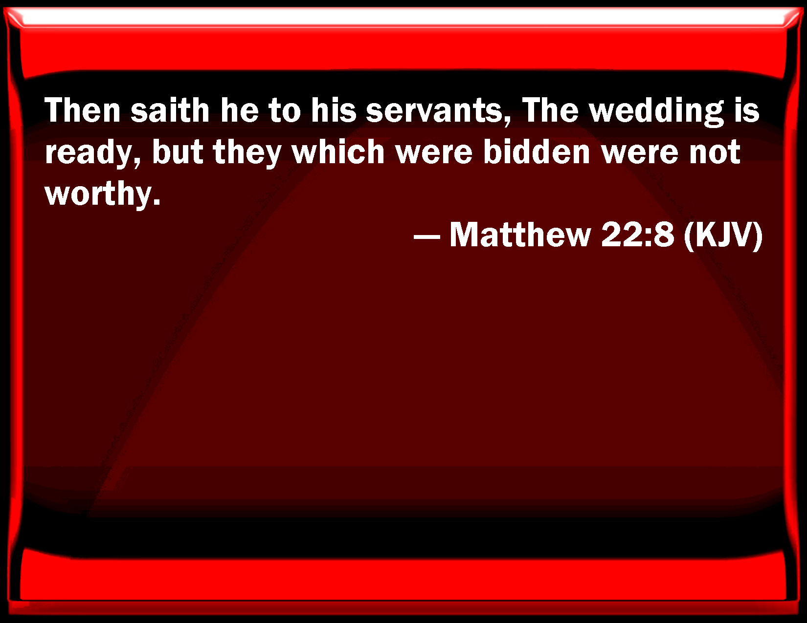 Bible Verse Slide Matthew 22:8 Then said he to his servants, The wedding is ready, but they which were bidden were not worthy. KJV: Then saith he to his servants, The wedding is ready, but they which were bidden were not worthy. DRB: Then he saith to his servants: The marriage indeed is ready; but they that were invited were not worthy. DBT: Then he says to his bondmen, The wedding feast is ready, but those invited were not worthy; ERV: Then saith he to his servants, The wedding is ready, but they that were bidden were not worthy. WBT: Then he saith to his servants, The wedding is ready, but they who were invited were not worthy. WEB: "Then he said to his servants, 'The wedding is ready, but those who were invited weren't worthy. YLT: then saith he to his servants, The marriage-feast indeed is ready, and those called were not worthy,Links Matthew 22:8 NIV • Matthew 22:8 NLT • Matthew 22:8 ESV • Matthew 22:8 NASB • Matthew 22:8 KJV • Matthew 22:8 Interlinear • Matthew 22:8 Commentaries • Matthew 22:8 Parallel Texts • Matthew 22:8 Bible Apps • Matthew 22:8 Parallel • Bible Hub |