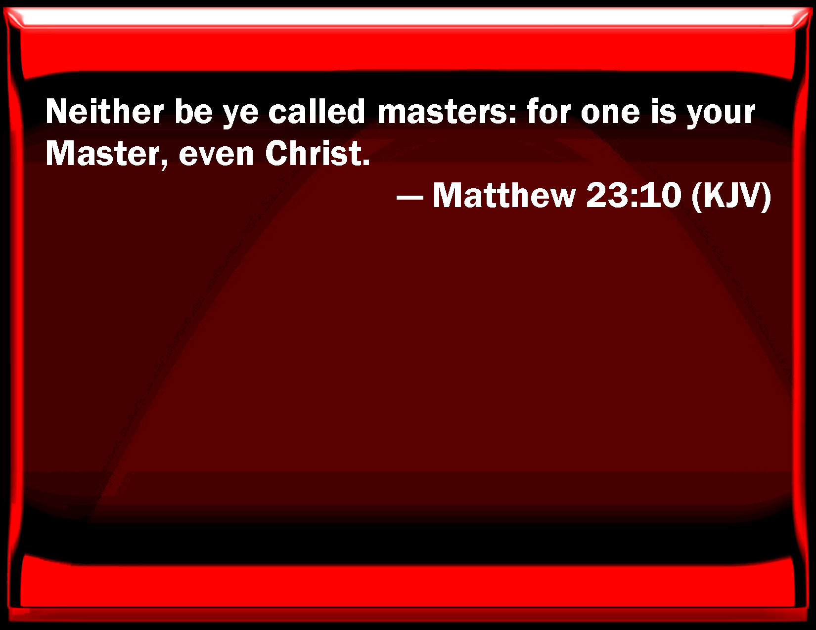 Bible Verse Slide Matthew 23:10 Neither be you called masters: for one is your Master, even Christ. KJV: Neither be ye called masters: for one is your Master, even Christ. DRB: Neither be ye called masters; for one is you master, Christ. DBT: Neither be called instructors, for one is your instructor, the Christ. ERV: Neither be ye called masters: for one is your master, even the Christ. WBT: Neither be ye called masters: for one is your master, even Christ. WEB: Neither be called masters, for one is your master, the Christ. YLT: nor may ye be called directors, for one is your director — the Christ.Links Matthew 23:10 NIV • Matthew 23:10 NLT • Matthew 23:10 ESV • Matthew 23:10 NASB • Matthew 23:10 KJV • Matthew 23:10 Interlinear • Matthew 23:10 Commentaries • Matthew 23:10 Parallel Texts • Matthew 23:10 Bible Apps • Matthew 23:10 Parallel • Bible Hub |
