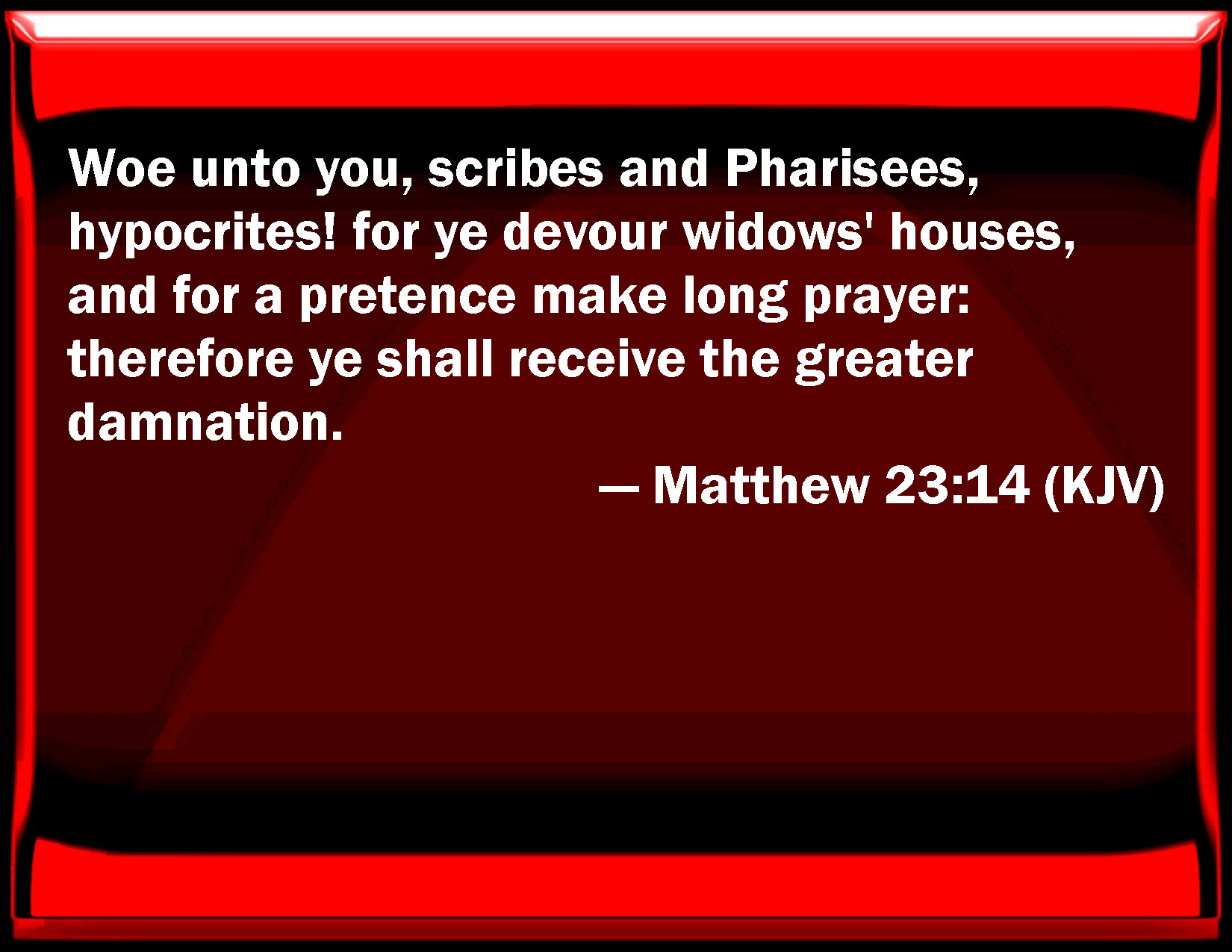 Bible Verse Slide Matthew 23:14 Woe to you, scribes and Pharisees, hypocrites! for you devour widows' houses, and for a pretense make long prayer: therefore you shall receive the greater damnation. KJV: Woe unto you, scribes and Pharisees, hypocrites! for ye devour widows' houses, and for a pretence make long prayer: therefore ye shall receive the greater damnation. DRB: Woe to you scribes and Pharisees, hypocrites: because you devour the houses of widows, praying long prayers. For this you shall receive the greater judgment. DBT: ERV: WBT: Woe to you, scribes and Pharisees, hypocrites! for ye devour widows' houses, and for a pretense make long prayer: therefore ye shall receive the greater damnation. WEB: "But woe to you, scribes and Pharisees, hypocrites! Because you shut up the Kingdom of Heaven against men; for you don't enter in yourselves, neither do you allow those who are entering in to enter. YLT: 'Woe to you, Scribes and Pharisees, hypocrites! because ye eat up the houses of the widows, and for a pretence make long prayers, because of this ye shall receive more abundant judgment.Links Matthew 23:14 NIV • Matthew 23:14 NLT • Matthew 23:14 ESV • Matthew 23:14 NASB • Matthew 23:14 KJV • Matthew 23:14 Interlinear • Matthew 23:14 Commentaries • Matthew 23:14 Parallel Texts • Matthew 23:14 Bible Apps • Matthew 23:14 Parallel • Bible Hub |