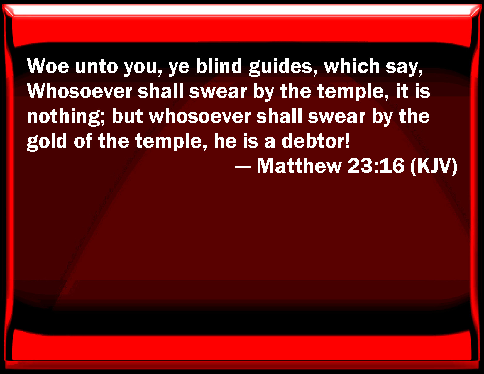 Bible Verse Slide Matthew 23:16 Woe to you, you blind guides, which say, Whoever shall swear by the temple, it is nothing; but whoever shall swear by the gold of the temple, he is a debtor! KJV: Woe unto you, ye blind guides, which say, Whosoever shall swear by the temple, it is nothing; but whosoever shall swear by the gold of the temple, he is a debtor! DRB: Woe to you blind guides, that say, Whosoever shall swear by the temple, it is nothing; but he that shall swear by the gold of the temple, is a debtor. DBT: Woe to you, blind guides, who say, Whosoever shall swear by the temple, it is nothing; but whosoever shall swear by the gold of the temple, he is a debtor. ERV: Woe unto you, ye blind guides, which say, Whosoever shall swear by the temple, it is nothing; but whosoever shall swear by the gold of the temple, he is a debtor. WBT: Woe to you, ye blind guides, who say, Whoever shall swear by the temple, it is nothing; but whoever shall swear by the gold of the temple, he is a debtor. WEB: "Woe to you, you blind guides, who say, 'Whoever swears by the temple, it is nothing; but whoever swears by the gold of the temple, he is obligated.' YLT: Woe to you, blind guides, who are saying, Whoever may swear by the sanctuary, it is nothing, but whoever may swear by the gold of the sanctuary — is debtor!Links Matthew 23:16 NIV • Matthew 23:16 NLT • Matthew 23:16 ESV • Matthew 23:16 NASB • Matthew 23:16 KJV • Matthew 23:16 Interlinear • Matthew 23:16 Commentaries • Matthew 23:16 Parallel Texts • Matthew 23:16 Bible Apps • Matthew 23:16 Parallel • Bible Hub |
