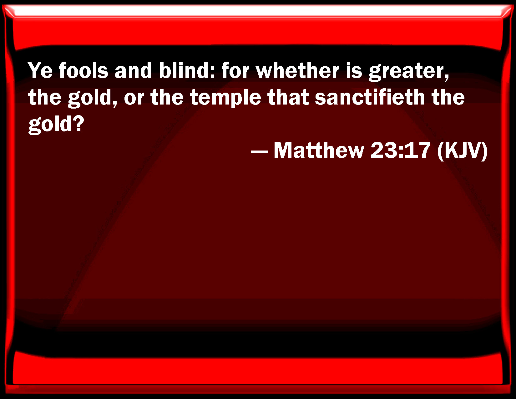 Bible Verse Slide Matthew 23:17 You fools and blind: for whether is greater, the gold, or the temple that sanctifies the gold? KJV: Ye fools and blind: for whether is greater, the gold, or the temple that sanctifieth the gold? DRB: Ye foolish and blind; for whether is greater, the gold, or the temple that sanctifieth the gold? DBT: Fools and blind, for which is greater, the gold, or the temple which sanctifies the gold? ERV: Ye fools and blind: for whether is greater, the gold, or the temple that hath sanctified the gold? WBT: Ye fools, and blind: for which is greater, the gold, or the temple that sanctifieth the gold? WEB: You blind fools! For which is greater, the gold, or the temple that sanctifies the gold? YLT: Fools and blind! for which is greater, the gold, or the sanctuary that is sanctifying the gold?Links Matthew 23:17 NIV • Matthew 23:17 NLT • Matthew 23:17 ESV • Matthew 23:17 NASB • Matthew 23:17 KJV • Matthew 23:17 Interlinear • Matthew 23:17 Commentaries • Matthew 23:17 Parallel Texts • Matthew 23:17 Bible Apps • Matthew 23:17 Parallel • Bible Hub |